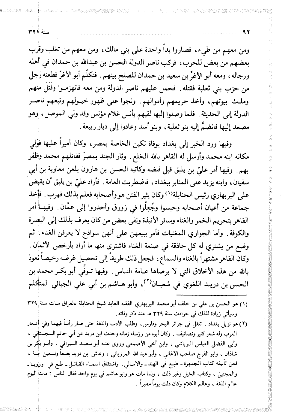 وفيها ورد الخبر إلى بغداد بوفاة تكين الخاصة بمصر وكان أميرا عليها فولي مكانه ابنه محمد وأرسل له القاهر بالله الخلع وثار الجند بمصر فقاتلهم محمد وظفر بهم وفيها أمر علي بن يلبق قبل قبضه وكاتبه الحسن بن هارون بلعن معاوية بن أبي سفيان وابنه يزيد على المنابر ببغداد فاضطربت العامة فأراد علي بن يلبق أن يقبض على البربهاري رئيس الحنابلة وكان يثير الفتن هو وأصحابه فغلم بذلك فهرب فأخذ جماعة من أعيان أصحابه حبسوا وجعلوا في زورق وأحدروا إلى عمان وفيها أمر القاهر بنحريم الخمر والغناء وسائر الأنبذة ونفى بعض من كان يعرف بذلك إلى البصرة والكوفة وأما الجواري المغنيات فأمر ببيعهن على أنهن سواذج لا يعرفن الغناء ثم وضع من يشتري له كل حاذقة في صنعة الغناء فاشترى منها ما أراد بأرخص الأثمان وكان القاهر مشتهرا بالغناء والسماع فجعل ذلك طريقا إلى تحصيل غرضه رخيصا نعوذ بالله من هذه الأخلاق التي لا يرضاها عامة الناس وفيها توفي أبو بكر محمد بن الحسن بن دريد اللغوي في شعبان وأبو هاشم بن أبي علي الجبائي المتكلم