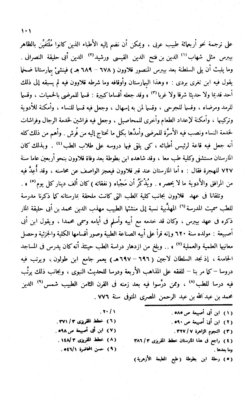 على ترجمة نحو أربعمائة طبيب عربى، ويمكن أن نضم إليه الأطباء الذين كانوا ملتفيّن بالظاهر بيبرس مثل شهاب (¬1) الدين بن فتح الدين القيسى ورشيد (¬2) الدين أبى حليقة النصرانى.
