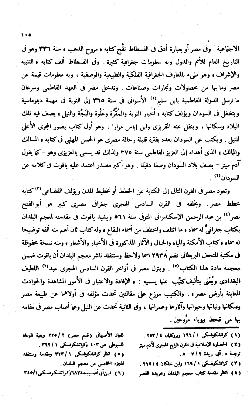 الاجتماعية. وفى مصر أو بعبارة أدق فى الفسطاط نقّح كتابه «مروج الذهب» سنة 336 وهو فى التاريخ العام للأمم والدول وبه معلومات جغرافية كثيرة. وفى الفسطاط ألف كتابه «التنبيه والإشراف» وهو ملئ بالمعارف الجغرافية الفلكية والطبيعية والوصفية، وبه معلومات قيمة عن مصر وما بها من محصولات وتجارات وصناعات. وتدخل مصر فى العهد الفاطمى وسرعان ما ترسل الدولة الفاطمية بابن سليم (¬1) الأسوانى فى سنة 365 إلى النوبة فى مهمة دبلوماسية ويتغلغل فى السودان ويؤلف كتابه «أخبار النوبة والمقرّة وعلوة والبجّة والنيل» يصف فيه تلك البلاد وسكانها، وينقل عنه المقريزى وابن إياس مرارا، وهو أول كتاب يصور المجرى الأعلى للنيل. ويكتب عن السودان بعده بفترة قليلة رحالة مصرى هو الحسن المهلبى فى كتابه «المسالك والممالك» الذى أهداه إلى العزيز الفاطمى سنة 375 ولذلك قد يسمى بالعزيزى وهو-كما يقول آدم ميتز-يصف بلاد السودان وصفا دقيقا. وهو أكبر مصدر اعتمد عليه ياقوت فى كلامه عن السودان (¬2).