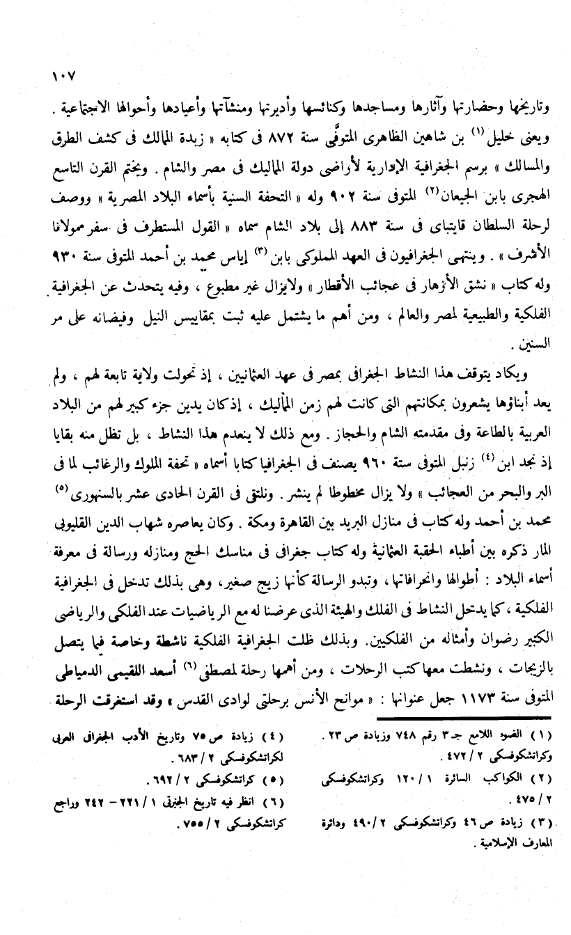 ويعنى خليل (¬1) بن شاهين الظاهرى المتوفّى سنة 872 فى كتابه «زبدة الممالك فى كشف الطرق والمسالك» برسم الجغرافية الإدارية لأراضى دولة المماليك فى مصر والشام. ويختم القرن التاسع الهجرى بابن الجيعان (¬2) المتوفى سنة 902 وله «التحفة السنية بأسماء البلاد المصرية» ووصف لرحلة السلطان قايتباى فى سنة 883 إلى بلاد الشام سماه «القول المستطرف فى سفر مولانا الأشرف». وينتهى الجغرافيون فى العهد المملوكى بابن (¬3) إياس محمد بن أحمد المتوفى سنة 930 وله كتاب «نشق الأزهار فى عجائب الأقطار» ولا يزال غير مطبوع، وفيه يتحدث عن الجغرافية.