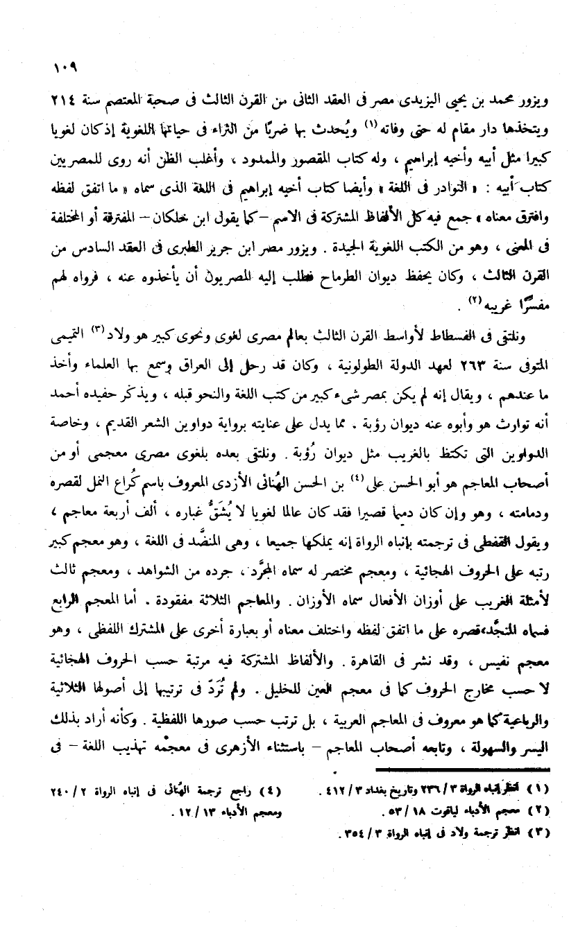ونلتقى فى الفسطاط لأواسط القرن الثالث بعالم مصرى لغوى ونحوى كبير هو ولاد (¬3) التميمى المتوفى سنة 263 لعهد الدولة الطولونية، وكان قد رحل إلى العراق وسمع بها العلماء وأخذ ما عندهم، ويقال إنه لم يكن بمصر شئ كبير من كتب اللغة والنحو قبله، ويذكر حفيده أحمد أنه توارث هو وأبوه عنه ديوان رؤبة، مما يدل على عنايته برواية دواوين الشعر القديم، وخاصة الدواوين التى تكتظ بالغريب مثل ديوان رؤبة. ونلتقى بعده بلغوى مصرى معجمى أو من أصحاب المعاجم هو أبو الحسن على (¬4) بن الحسن الهنائى الأزدى المعروف باسم كراع النمل لقصره ودمامته، وهو وإن كان دميما قصيرا فقد كان عالما لغويا لا يشقّ غباره، ألف أربعة معاجم، ويقول القفطى فى ترجمته بإنباه الرواة إنه يملكها جميعا، وهى المنضّد فى اللغة، وهو معجم كبير رتبه على الحروف الهجائية، ومعجم مختصر له سماه المجرّد، جرده من الشواهد، ومعجم ثالث لأمثلة الغريب على أوزان الأفعال سماه الأوزان. والمعاجم الثلاثة مفقودة، أما المعجم الرابع فسماه المنجّد، قصره على ما اتفق لفظه واختلف معناه أو بعبارة أخرى على المشترك اللفظى، وهو معجم نفيس، وقد نشر فى القاهرة. والألفاظ المشتركة فيه مرتبة حسب الحروف الهجائية لا حسب مخارج الحروف كما فى معجم العين للخليل. ولم تردّ فى ترتيبها إلى أصولها الثلاثية والرباعية كما هو معروف فى المعاجم العربية، بل ترتب حسب صورها اللفظية. وكأنه أراد بذلك اليسر والسهولة، وتابعه أصحاب المعاجم-باستثناء الأزهرى فى معجمه تهذيب اللغة-فى