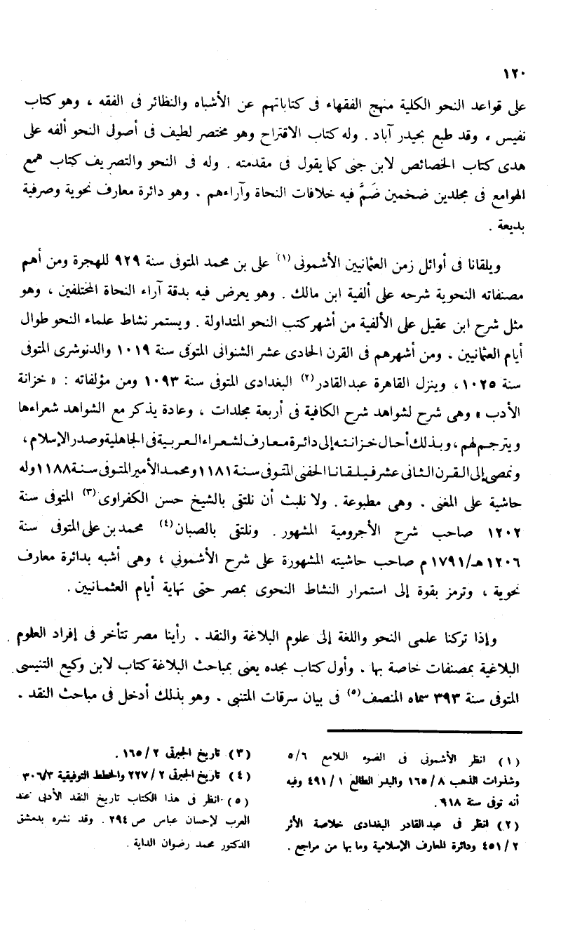 ويلقانا فى أوائل زمن العثمانيين الأشمونى (¬1) على بن محمد المتوفى سنة 929 للهجرة ومن أهم مصنفاته النحوية شرحه على ألفية ابن مالك. وهو يعرض فيه بدقة آراء النحاة المختلفين، وهو مثل شرح ابن عقيل على الألفية من أشهر كتب النحو المتداولة. ويستمر نشاط علماء النحو طوال أيام العثمانيين، ومن أشهرهم فى القرن الحادى عشر الشنوانى المتوفى سنة 1019 والدنوشرى المتوفى سنة 1025، وينزل القاهرة عبد القادر (¬2) البغدادى المتوفى سنة 1093 ومن مؤلفاته: «خزانة الأدب» وهى شرح لشواهد شرح الكافية فى أربعة مجلدات، وعادة يذكر مع الشواهد شعراءها ويترجم لهم، وبذلك أحال خزانته إلى دائرة معارف لشعراء العربية فى الجاهلية وصدر الإسلام، ونمصى إلى القرن الثانى عشر فيلقانا الخفى المتوفى سنة 1181 ومحمد الأمير المتوفى سنة 1188 وله حاشية على المغنى. وهى مطبوعة. ولا نلبث أن نلتقى بالشيخ حسن الكفراوى (¬3) المتوفى سنة 1202 صاحب شرح الأجرومية المشهور. ونلتقى بالصبان (¬4) محمد بن على المتوفى سنة 1206 هـ/1791 م صاحب حاشيته المشهورة على شرح الأشمونى، وهى أشبه بدائرة معارف نحوية، وترمز بقوة إلى استمرار النشاط النحوى بمصر حتى نهاية أيام العثمانيين.