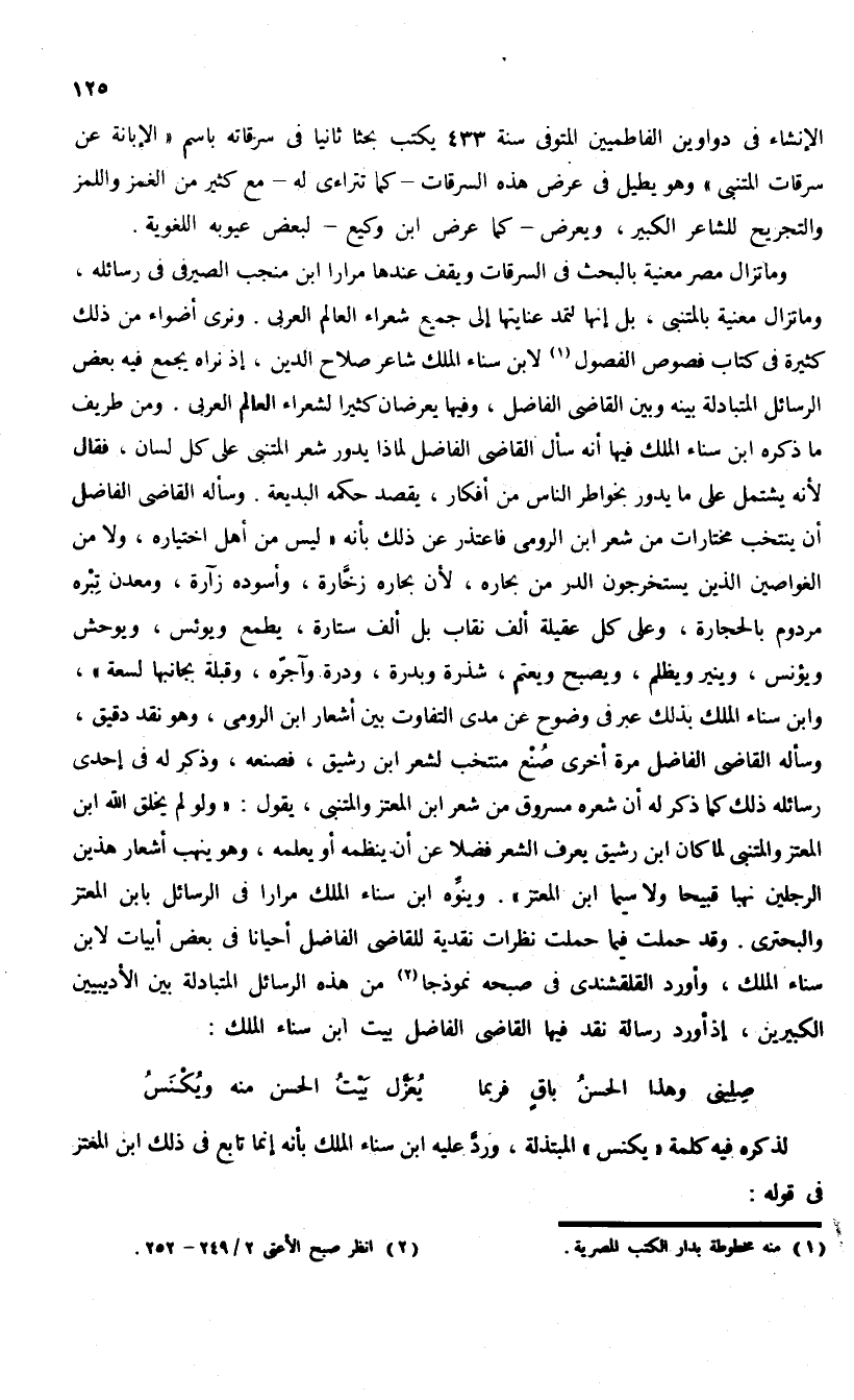 وما تزال مصر معنية بالبحث فى السرقات ويقف عندها مرارا ابن منجب الصيرفى فى رسائله، وما تزال معنية بالمتنبى، بل إنها لتمد عنايتها إلى جميع شعراء العالم العربى. ونرى أضواء من ذلك كثيرة فى كتاب فصوص الفصول (¬1) لابن سناء الملك شاعر صلاح الدين، إذ نراه يجمع فيه بعض الرسائل المتبادلة بينه وبين القاضى الفاضل، وفيها يعرضان كثيرا لشعراء العالم العربى. ومن طريف ما ذكره ابن سناء الملك فيها أنه سأل القاضى الفاضل لماذا يدور شعر المتنبى على كل لسان، فقال لأنه يشتمل على ما يدور بخواطر الناس من أفكار، يقصد حكمه البديعة. وسأله القاضى الفاضل أن ينتخب مختارات من شعر ابن الرومى فاعتذر عن ذلك بأنه «ليس من أهل اختياره، ولا من الغواصين الذين يستخرجون الدر من بحاره، لأن بحاره زخّارة، وأسوده زآرة، ومعدن تبره مردوم بالحجارة، وعلى كل عقيلة ألف نقاب بل ألف ستارة، يطمع ويوئس، ويوحش ويؤنس، وينير ويظلم، ويصبح ويعتم، شذرة وبدرة، ودرة وآجرّه، وقبلة بجانبها لسعة»، وابن سناء الملك بذلك عبر فى وضوح عن مدى التفاوت بين أشعار ابن الرومى، وهو نقد دقيق، وسأله القاضى الفاضل مرة أخرى صنع منتخب لشعر ابن رشيق، فصنعه، وذكر له فى إحدى رسائله ذلك كما ذكر له أن شعره مسروق من شعر ابن المعتز والمتنبى، يقول: «ولو لم يخلق الله ابن المعتز والمتنبى لما كان ابن رشيق يعرف الشعر فضلا عن أن ينظمه أو يعلمه، وهو ينهب أشعار هذين الرجلين نهبا قبيحا ولا سيما ابن المعتز». وينوّه ابن سناء الملك مرارا فى الرسائل بابن المعتز والبحترى. وقد حملت فيما حملت نظرات نقدية للقاضى الفاضل أحيانا فى بعض أبيات لابن سناء الملك، وأورد القلقشندى فى صبحه نموذجا (¬2) من هذه الرسائل المتبادلة بين الأديبيين الكبيرين، إذ أورد رسالة نقد فيها القاضى الفاضل بيت ابن سناء الملك: