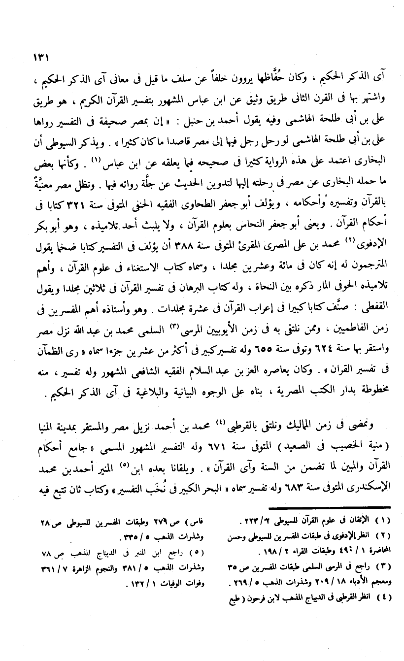 آى الذكر الحكيم، وكان حفّاظها يروون خلفا عن سلف ما قيل فى معانى آى الذكر الحكيم، واشتهر بها فى القرن الثانى طريق وثيق عن ابن عباس المشهور بتفسير القرآن الكريم، هو طريق على بن أبى طلحة الهاشمى وفيه يقول أحمد بن حنبل: «إن بمصر صحيفة فى التفسير رواها على بن أبى طلحة الهاشمى لو رحل رجل فيها إلى مصر قاصدا ما كان كثيرا». ويذكر السيوطى أن البخارى اعتمد على هذه الرواية كثيرا فى صحيحه فيما يعلقه عن ابن عباس (¬1). وكأنها بعض ما حمله البخارى عن مصر فى رحلته إليها لتدوين الحديث عن جلّة رواته فيها. وتظل مصر معنيّة بالقرآن وتفسيره وأحكامه، ويؤلف أبو جعفر الطحاوى الفقيه الحنفى المتوفى سنة 321 كتابا فى أحكام القرآن. ويعنى أبو جعفر النحاس بعلوم القرآن، ولا يلبث أحد تلاميذه، وهو أبو بكر الإدفوى (¬2) محمد بن على المصرى المقرئ المتوفى سنة 388 أن يؤلف فى التفسير كتابا ضخما يقول المترجمون له إنه كان فى مائة وعشرين مجلدا، وسماه كتاب الاستغناء فى علوم القرآن، وأهم تلاميذه الحوفى المار ذكره بين النحاة، وله كتاب البرهان فى تفسير القرآن فى ثلاثين مجلدا ويقول القفطى: صنّف كتابا كبيرا فى إعراب القرآن فى عشرة مجلدات. وهو وأستاذه أهم المفسرين فى زمن الفاطميين، وممن نلتقى به فى زمن الأيوبيين المرسى (¬3) السلمى محمد بن عبد الله نزل مصر واستقر بها سنة 624 وتوفى سنة 655 وله تفسير كبير فى أكثر من عشرين جزءا سماه «رى الظمآن فى تفسير القران». وكان يعاصره العز بن عبد السلام الفقيه الشافعى المشهور وله تفسير، منه مخطوطة بدار الكتب المصرية، بناه على الوجوه البيانية والبلاغية فى آى الذكر الحكيم.