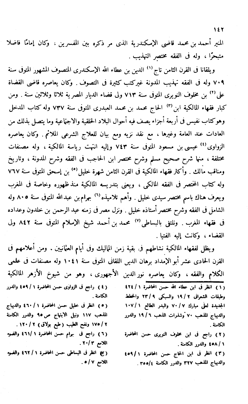 ويلقانا فى القرن الثامن تاج (¬1) الدين بن عطاء الله الإسكندرى المتصوف المشهور المتوفى سنة 709 وله فى الفقه تهذيب المدونة غير كتب كثيرة فى التصوف. وكان يعاصره قاضى القضاة على (¬2) بن مخلوف النويرى المتوفى سنة 713 ولى قضاء الديار المصرية ثلاثا وثلاثين سنة. ومن كبار فقهاء المالكية ابن (¬3) الحاج محمد بن محمد العبدرى المتوفى سنة 737 وله كتاب المدخل وهو كتاب نفيس فى أربعة أجزاء يصف فيه أحوال البلاد الخلقية والاجتماعية وما يتصل بذلك من العادات عند العامة وغيرها، مع نقد نزيه ومع بيان للعلاج الشرعى الملائم. وكان يعاصره الزواوى (¬4) عيسى بن مسعود المتوفى سنة 743 وإليه انتهت رياسة المالكية، وله مصنفات مختلفة، منها شرح صحيح مسلم وشرح مختصر ابن الحاجب فى الفقه وشرح المدونة، وتاريخ ومناقب مالك. وأكثر فقهاء المالكية فى القرن الثامن شهرة خليل (¬5) بن إسحق المتوفى سنة 767 وله كتاب المختصر فى الفقه المالكى، ويعنى بتدريسه المالكية منذ ظهوره وخاصة فى المغرب ويعرف هناك باسم مختصر سيدى خليل. وأهم تلاميذه (¬6) بهرام بن عبد الله المتوفى سنة 805 وله الشامل فى الفقه وشرح مختصر أستاذه خليل. ونزل مصر فى زمنه عبد الرحمن بن خلدون وعداده فى فقهاء المغرب. ونلتقى بالبساطى (¬7) محمد بن أحمد شيخ الإسلام المتوفى سنة 842 ولى القضاء، وكانت إليه الفتيا.