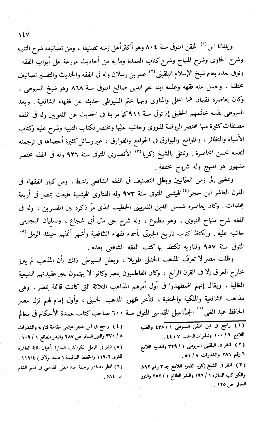 وكان يعاصره فقيهان هما المحلى والمناوى وبهما ختم السيوطى حديثه عن فقهاء الشافعية. ويعد السيوطى نفسه خاتمهم الحقيقى إذ توفى سنة 911 كما مر بنا فى الحديث عن اللغويين وله فى الفقه مصنفات كثيرة منها مختصر الروضة للنووى وحاشية عليها ومختصر لكتاب التنبيه وشرح عليه وكتاب الأشباه والنظائر، واللوامع والبوارق فى الجوامع والفوارق، غير رسائل كثيرة أحصاها فى ترجمته لنفسه بحسن المحاضرة. ونلتقى بالشيخ زكريا (¬3) الأنصارى المتوفى سنة 926 وله فى الفقه مختصر مشهور هو المنهج وله شروح مختلفة.