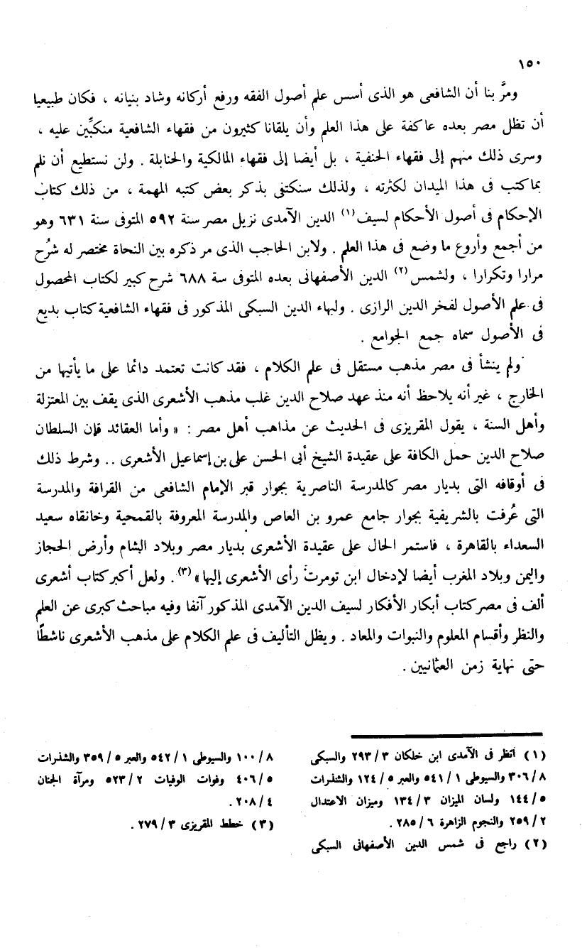 ولم ينشأ فى مصر مذهب مستقل فى علم الكلام، فقد كانت تعتمد دائما على ما يأتيها من الخارج، غير أنه يلاحظ أنه منذ عهد صلاح الدين غلب مذهب الأشعرى الذى يقف بين المعتزلة وأهل السنة، يقول المقريزى فى الحديث عن مذاهب أهل مصر: «وأما العقائد فإن السلطان صلاح الدين حمل الكافة على عقيدة الشيخ أبى الحسن على بن إسماعيل الأشعرى. . وشرط ذلك فى أوقافه التى بديار مصر كالمدرسة الناصرية بجوار قبر الإمام الشافعى من القرافة والمدرسة التى عرفت بالشريفية بجوار جامع عمرو بن العاص والمدرسة المعروفة بالقمحية وخانقاه سعيد السعداء بالقاهرة، فاستمر الحال على عقيدة الأشعرى بديار مصر وبلاد الشام وأرض الحجاز واليمن وبلاد المغرب أيضا لإدخال ابن تومرت رأى الأشعرى إليها» (¬3). ولعل أكبر كتاب أشعرى ألف فى مصر كتاب أبكار الأفكار لسيف الدين الآمدى المذكور آنفا وفيه مباحث كبرى عن العلم والنظر وأقسام المعلوم والنبوات والمعاد. ويظل التأليف فى علم الكلام على مذهب الأشعرى ناشطا حتى نهاية زمن العثمانيين.