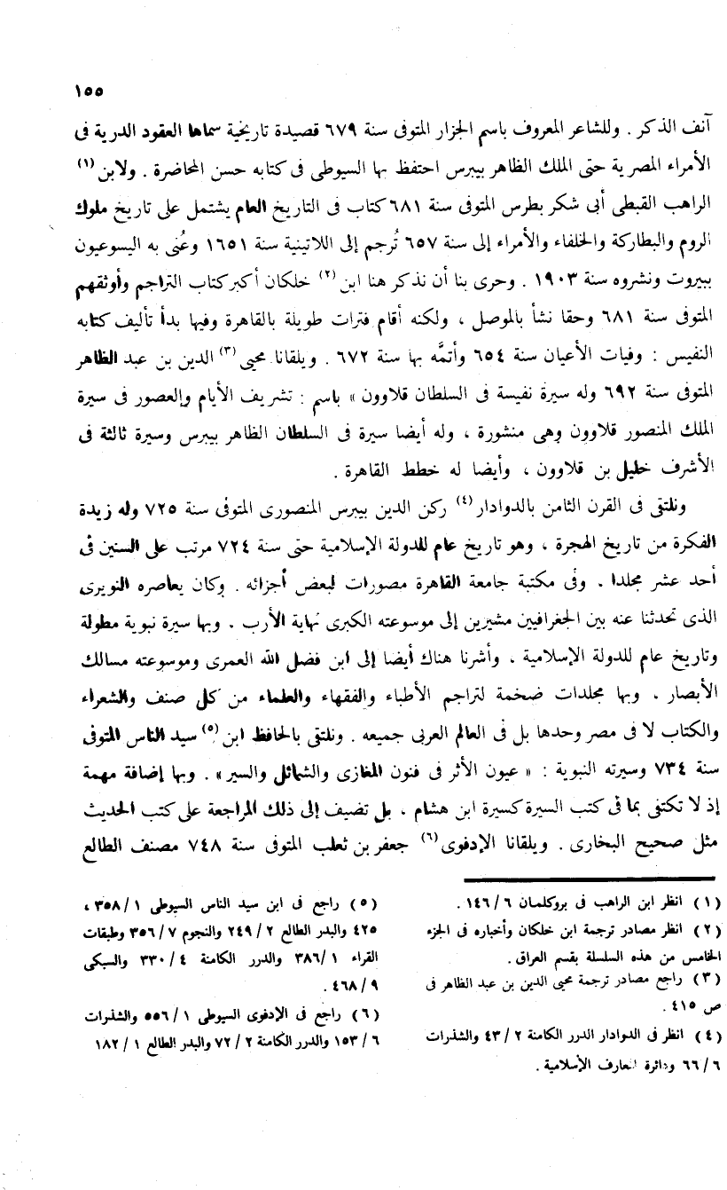 آنف الذكر. وللشاعر المعروف باسم الجزار المتوفى سنة 679 قصيدة تاريخية سماها العقود الدرية فى الأمراء المصرية حتى الملك الظاهر بيبرس احتفظ بها السيوطى فى كتابه حسن المحاضرة. ولابن (¬1) الراهب القبطى أبى شكر بطرس المتوفى سنة 681 كتاب فى التاريخ العام يشتمل على تاريخ ملوك الروم والبطاركة والخلفاء والأمراء إلى سنة 657 ترجم إلى اللاتينية سنة 1651 وعنى به اليسوعيون ببيروت ونشروه سنة 1903. وحرى بنا أن نذكر هنا ابن (¬2) خلكان أكبر كتاب التراجم وأوثقهم المتوفى سنة 681 وحقا نشأ بالموصل، ولكنه أقام فترات طويلة بالقاهرة وفيها بدأ تأليف كتابه النفيس: وفيات الأعيان سنة 654 وأتمّه بها سنة 672. ويلقانا محيى (¬3) الدين بن عبد الظاهر المتوفى سنة 692 وله سيرة نفيسة فى السلطان قلاوون» باسم: تشريف الأيام والعصور فى سيرة الملك المنصور قلاوون وهى منشورة، وله أيضا سيرة فى السلطان الظاهر بيبرس وسيرة ثالثة فى الأشرف خليل بن قلاوون، وأيضا له خطط القاهرة.