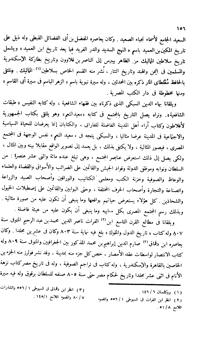 ويلقانا بهاء الدين السبكى الذى ذكرناه بين فقهاء الشافعية، وله كتابه النفيس «طبقات الشافعية». ونراه يصل التاريخ بالمجتمع فى كتابه «معيد النعم» وهو يلتقى بكتاب الجمهورية لأفلاطون وكتاب آراء أهل المدينة الفاضلة للفارابى، والكتابان إنما يعرضان للحياة السياسية والاجتماعية فى المدينة عرضا مثاليا، والسبكى يتجه فى «معيد النعم» نفس الوجهة فى المجتمع المصرى، فيصور المثالية، ولا يكتفى بذلك، بل يعمد إلى تصوير الواقع مقابلا بينه وبين المثال، ولكى يصل إلى ذلك استعرض عناصر المجتمع، وهى تبلغ عنده مائة واثنى عشر عنصرا: من السلطان ونوابه وموظفى الدولة وقواد الجيش والقائمين على الضرائب والأسواق والقضاة والعلماء والوعاظ والصوفية وخزنة الكتب ومعلمى الكتاتيب والوراقين وأصحاب الصيد والزراعة والصناعة والتجارة وأصحاب الحرف المختلفة، وحتى البوابين والقائمين على إصطبلات الخيول والشحاذين. كل هؤلاء يستعرض حياتهم بواقعها وما ينبغى أن تكون عليه من صورة مثالية.