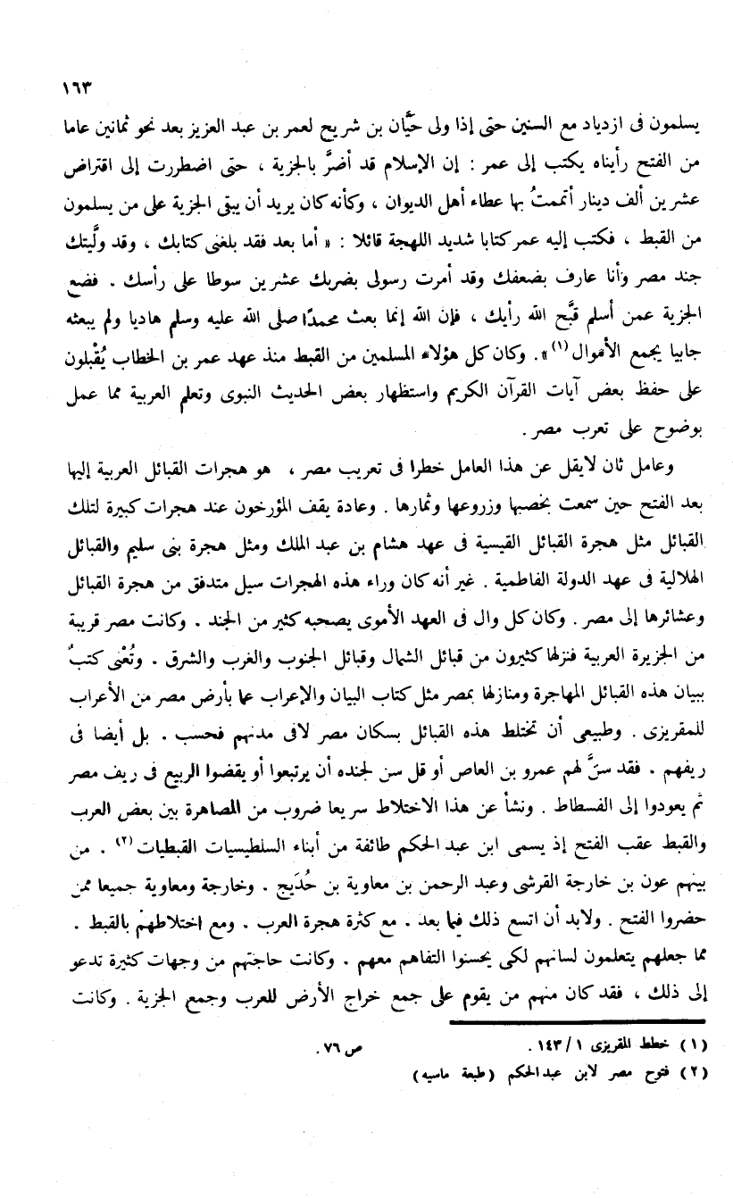 يسلمون فى ازدياد مع السنين حتى إذا ولى حيّان بن شريح لعمر بن عبد العزيز بعد نحو ثمانين عاما من الفتح رأيناه يكتب إلى عمر: إن الإسلام قد أضرّ بالجزية، حتى اضطررت إلى اقتراض عشرين ألف دينار أتممت بها عطاء أهل الديوان، وكأنه كان يريد أن يبقى الجزية على من يسلمون من القبط، فكتب إليه عمر كتابا شديد اللهجة قائلا: «أما بعد فقد بلغنى كتابك، وقد ولّيتك جند مصر وأنا عارف بضعفك وقد أمرت رسولى بضربك عشرين سوطا على رأسك. فضع الجزية عمن أسلم قبّح الله رأيك، فإن الله إنما بعث محمدا صلى الله عليه وسلم هاديا ولم يبعثه جابيا يجمع الأموال (¬1)». وكان كل هؤلاء المسلمين من القبط منذ عهد عمر بن الخطاب يقبلون على حفظ بعض آيات القرآن الكريم واستظهار بعض الحديث النبوى وتعلم العربية مما عمل بوضوح على تعرب مصر.