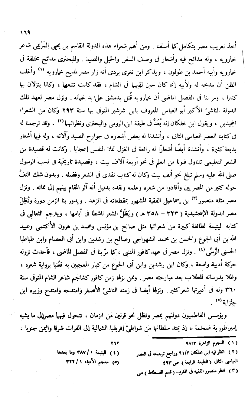 أخذ تعريب مصر يتكامل كما أسلفنا. ومن أهم شعراء هذه الدولة القاسم بن يحيى المريمى شاعر خمارويه، وله مدائح فيه وأشعار فى وصف السفن والخيل والصيد. وللبحترى مدائح مختلفة فى خمارويه وأبيه أحمد بن طولون، ويذكر ابن تغرى بردى أنه زار مصر لمديح خمارويه (¬1) وأغلب الظن أن مديحه له ولأبيه إنما كان حين لقيهما فى الشام، فقد كانت تتبعهما، وكانا ينزلان بها كثيرا، ومر بنا فى الفصل الماضى أن خمارويه قتل بدمشق على يد غلمانه. ونزل مصر لعهد تلك الدولة الناشى الأكبر أبو العباس المعروف بابن شرشير المتوفى بها سنة 293 وكان من الشعراء المجيدين، ويقول ابن خلكان إنه يعدّ فى طبقة ابن الرومى والبحترى ونظرائهما (¬2)، وقد ترجمنا له فى كتابنا العصر العباسى الثانى، وأنشدنا له بعض أشعاره فى جوارح الصيد وآلاته، وله فيها أشعار بديعة كثيرة، وأنشدنا أيضا أشعارا له رائعة فى الغزل تملأ النفس إعجابا. وكانت له قصيدة من الشعر التعليمى تتناول فنونا من العلم فى نحو أربعة آلاف بيت، وقصيدة تاريخية فى نسب الرسول صلى الله عليه وسلم تبلغ نحو ألف بيت وكان له كتاب نقدى فى الشعر وفضله. وبدون شك التفّ حوله كثير من المصريين وأفادوا من شعره وعلمه ونقده بدليل أنه آثر المقام بينهم إلى مماته. ونزل مصر مثله منصور (¬3) بن إسماعيل الفقية المشهور بمقطعاته فى الزهد. ويدور بنا الزمن دورة وتظلّ مصر الدولة الإخشيدية (323 - 358 هـ) ويظلّ الشعر ناشطا فى أيامها، ويترجم الثعالبى فى كتابه اليتيمة لطائفة كبيرة من شعرائها مثل صالح بن مؤنس ومحمد بن هرون الأكتمى وعبيد الله بن أبى الجوع والحسن بن محمد الشهواجى وصالح بن رشدين وابن أبى العصام وابن طباطبا الحسنى الرّسّى (¬4). ونزل مصر فى عهد كافور المتنبى، كما مرّ بنا فى الفصل الماضى، فأحدث نزوله حركة أدبية واسعة، وكان ابن رشدين وابن أبى الجوع من كبار المعجبين به فعنيا برواية شعره، وظلا يدرسانه للطلاب بعد مبارحته مصر. وممن نزلها زمن كافور كشاجم شاعر الشام المتوفى سنة 360 وله فى أديرتها شعر كثير. ونزلها أيضا فى زمنه الناشى الأصغر وامتدحه وامتدح وزيره ابن حنزابة (¬5).