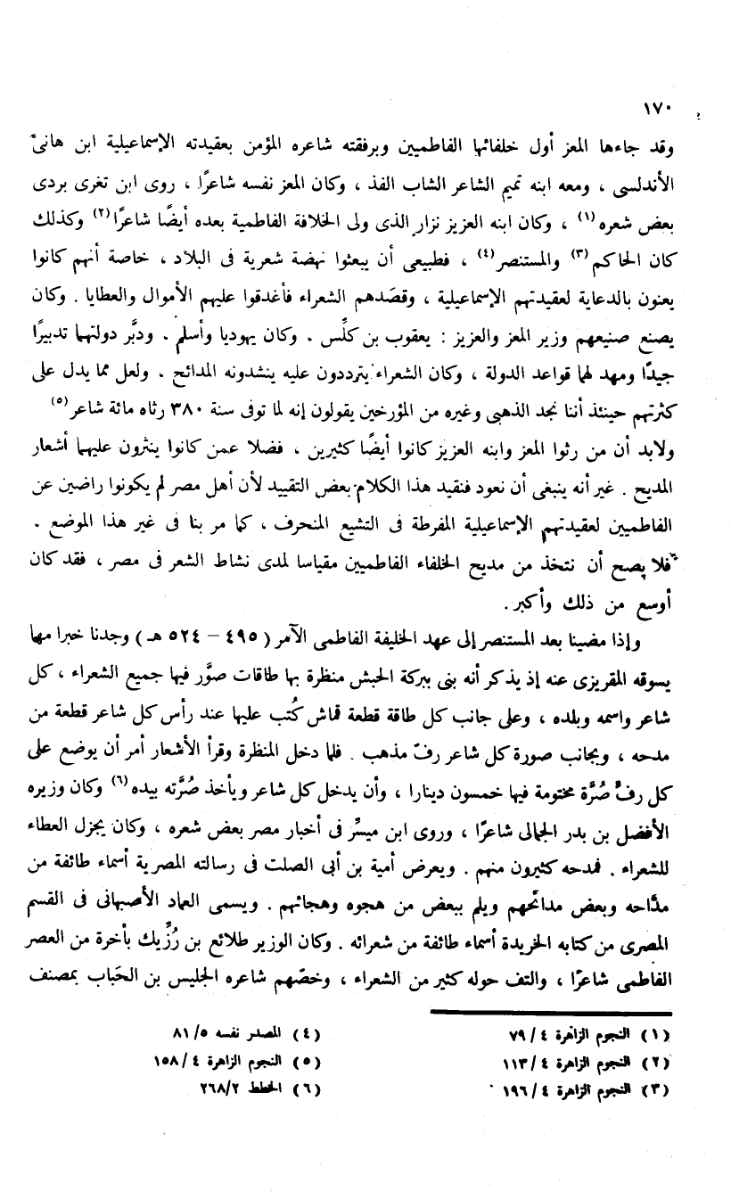 وقد جاءها المعز أول خلفائها الفاطميين وبرفقته شاعره المؤمن بعقيدته الإسماعيلية ابن هانى الأندلسى، ومعه ابنه تميم الشاعر الشاب الفذ، وكان المعز نفسه شاعرا، روى ابن تغرى بردى بعض شعره (¬1)، وكان ابنه العزيز نزار الذى ولى الخلافة الفاطمية بعده أيضا شاعرا (¬2) وكذلك كان الحاكم (¬3) والمستنصر (¬4)، فطبيعى أن يبعثوا نهضة شعرية فى البلاد، خاصة أنهم كانوا يعنون بالدعاية لعقيدتهم الإسماعيلية، وقصدهم الشعراء فأغدقوا عليهم الأموال والعطايا. وكان يصنع صنيعهم وزير المعز والعزيز: يعقوب بن كلّس، وكان يهوديا وأسلم، ودبّر دولتهما تدبيرا جيدا ومهد لهما قواعد الدولة، وكان الشعراء يترددون عليه ينشدونه المدائح، ولعل مما يدل على كثرتهم حينئذ أننا نجد الذهبى وغيره من المؤرخين يقولون إنه لما توفى سنة 380 رثاه مائة شاعر (¬5).