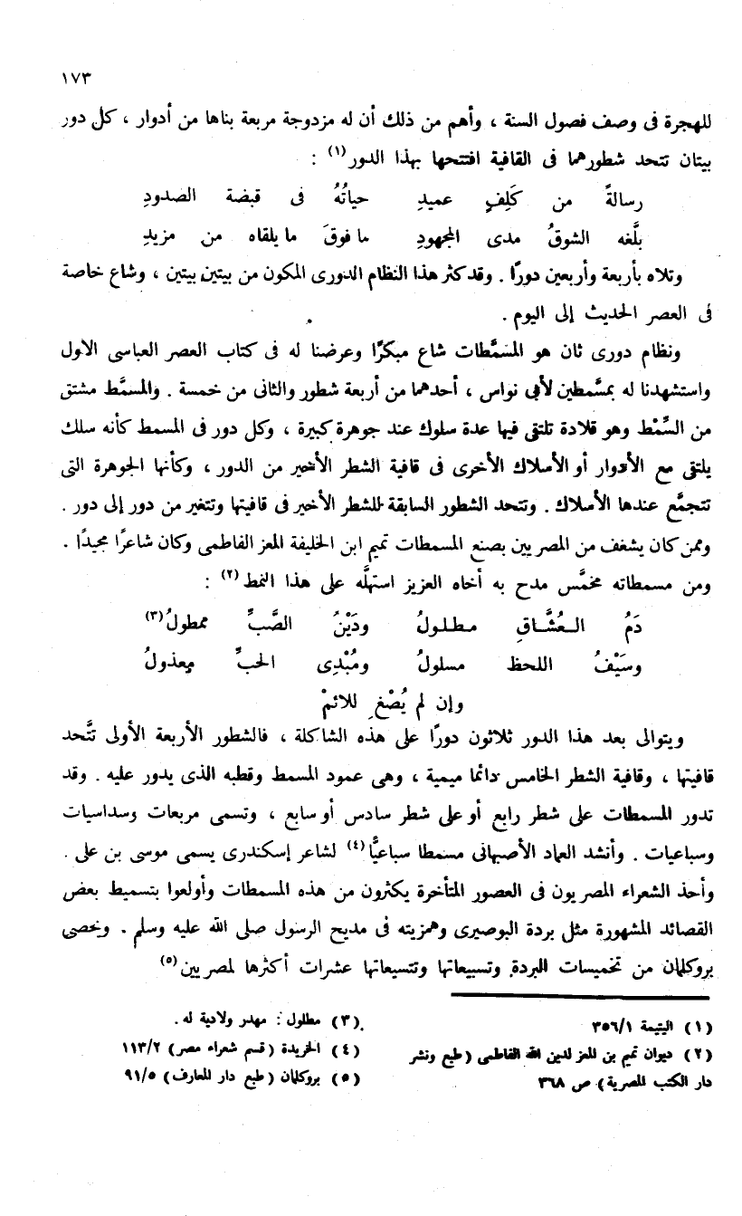 ويتوالى بعد هذا الدور ثلاثون دورا على هذه الشاكلة، فالشطور الأربعة الأولى تتّحد قافيتها، وقافية الشطر الخامس دائما ميمية، وهى عمود المسمط وقطبه الذى يدور عليه. وقد تدور المسمطات على شطر رابع أو على شطر سادس أو سابع، وتسمى مربعات وسداسيات وسباعيات. وأنشد العماد الأصبهانى مسمطا سباعيّا (¬4) لشاعر إسكندرى يسمى موسى بن على وأخذ الشعراء المصريون فى العصور المتأخرة يكثرون من هذه المسمطات وأولعوا بتسميط بعض القصائد المشهورة مثل بردة البوصيرى وهمزيته فى مديح الرسول صلى الله عليه وسلم. ويحصى بروكلمان من تخميسات البردة وتسبيعاتها وتتسيعاتها عشرات أكثرها لمصريين (¬5).
