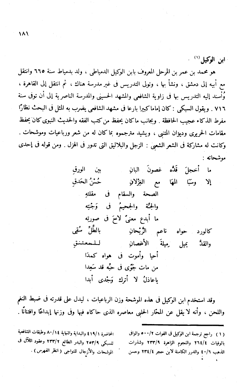 (¬1) راجع ترجمة ابن الوكيل فى الفوات 2/ 500 والوافى بالوفيات 4/ 264 والنجوم الزاهرة 9/ 233 وشذرات الذهب 6/ 40 والدرر الكامنة لابن حجر 4/ 234 وحسن المحاضرة 1/ 419 والبداية والنهاية 14/ 80 وطبقات الشافعية للسبكى 9/ 253 والبدر الطالع 2/ 233 وعقود اللآل فى الموشحات والأزجال للنواجى (انظر الفهرس).