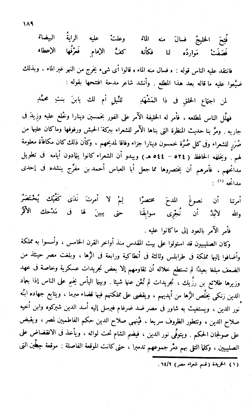 فهلّل الناس لمطلعه، فأمر له الخليفة الآمر على الفور بخمسين دينارا وخلع عليه وزيد فى جاريه. ومرّ بنا حديث المنظرة التى بناها الآمر للشعراء ببركة الحبش ورفوفها وما كان عليها من صرر للشعراء وفى كل صرّة خمسون دينارا جزاء وفاقا لمديحهم، وكأن ذلك كان مكافأة معلومة لهم. ويخلفه الحافظ (524 - 544 هـ) ويبدو أن الشعراء كانوا يتمادون أيامه فى تطويل مدائحهم، فأمرهم أن يختصروها مما جعل أبا العباس أحمد بن مفرّج ينشده فى إحدى مدائحه (¬1):