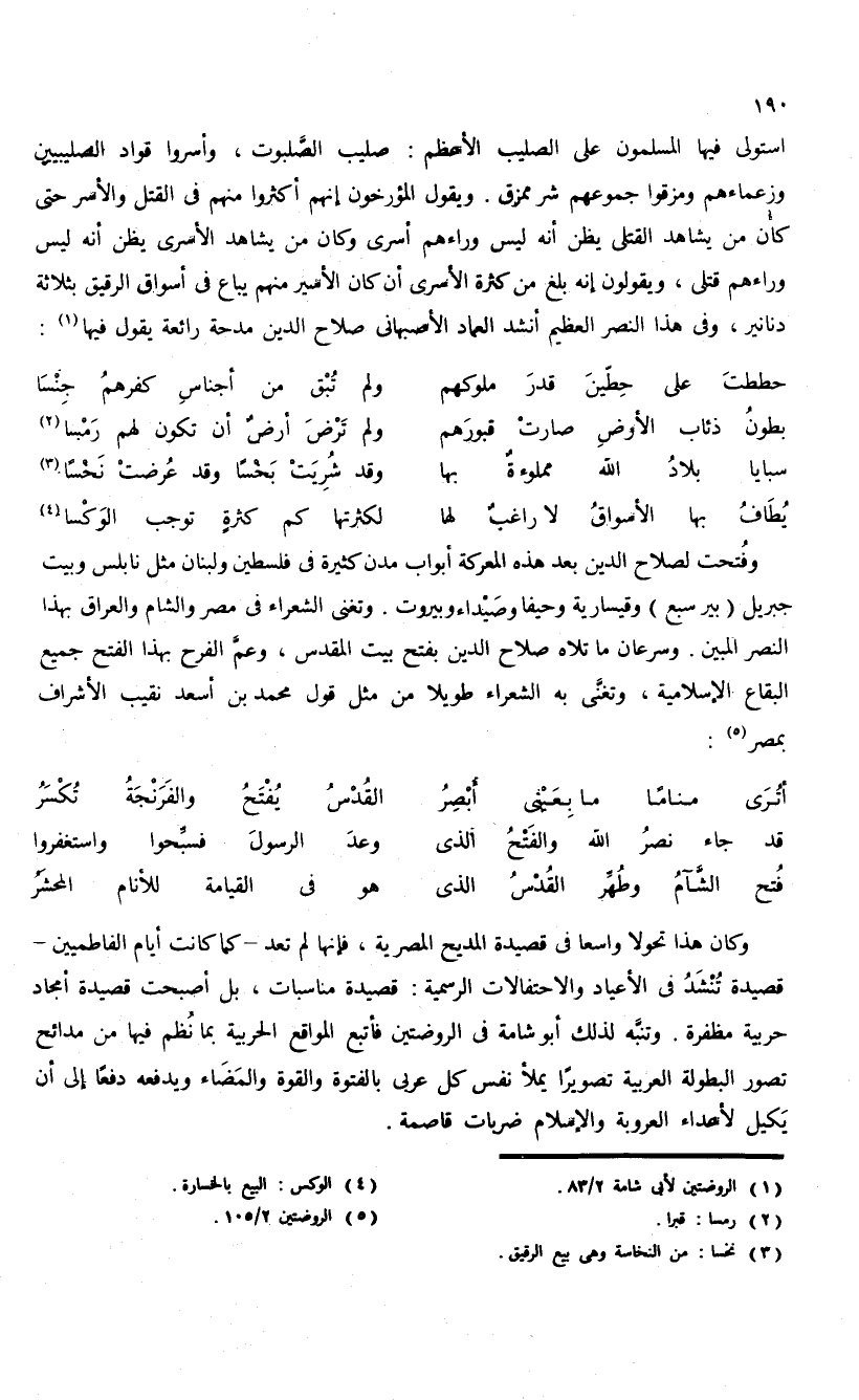 وكان هذا تحولا واسعا فى قصيدة المديح المصرية، فإنها لم تعد-كما كانت أيام الفاطميين- قصيدة تنشد فى الأعياد والاحتفالات الرسمية: قصيدة مناسبات، بل أصبحت قصيدة أمجاد حربية مظفرة. وتنبّه لذلك أبو شامة فى الروضتين فأتبع المواقع الحربية بما نظم فيها من مدائح تصور البطولة العربية تصويرا يملأ نفس كل عربى بالفتوة والقوة والمضاء ويدفعه دفعا إلى أن يكيل لأعداء العروبة والإسلام ضربات قاصمة.