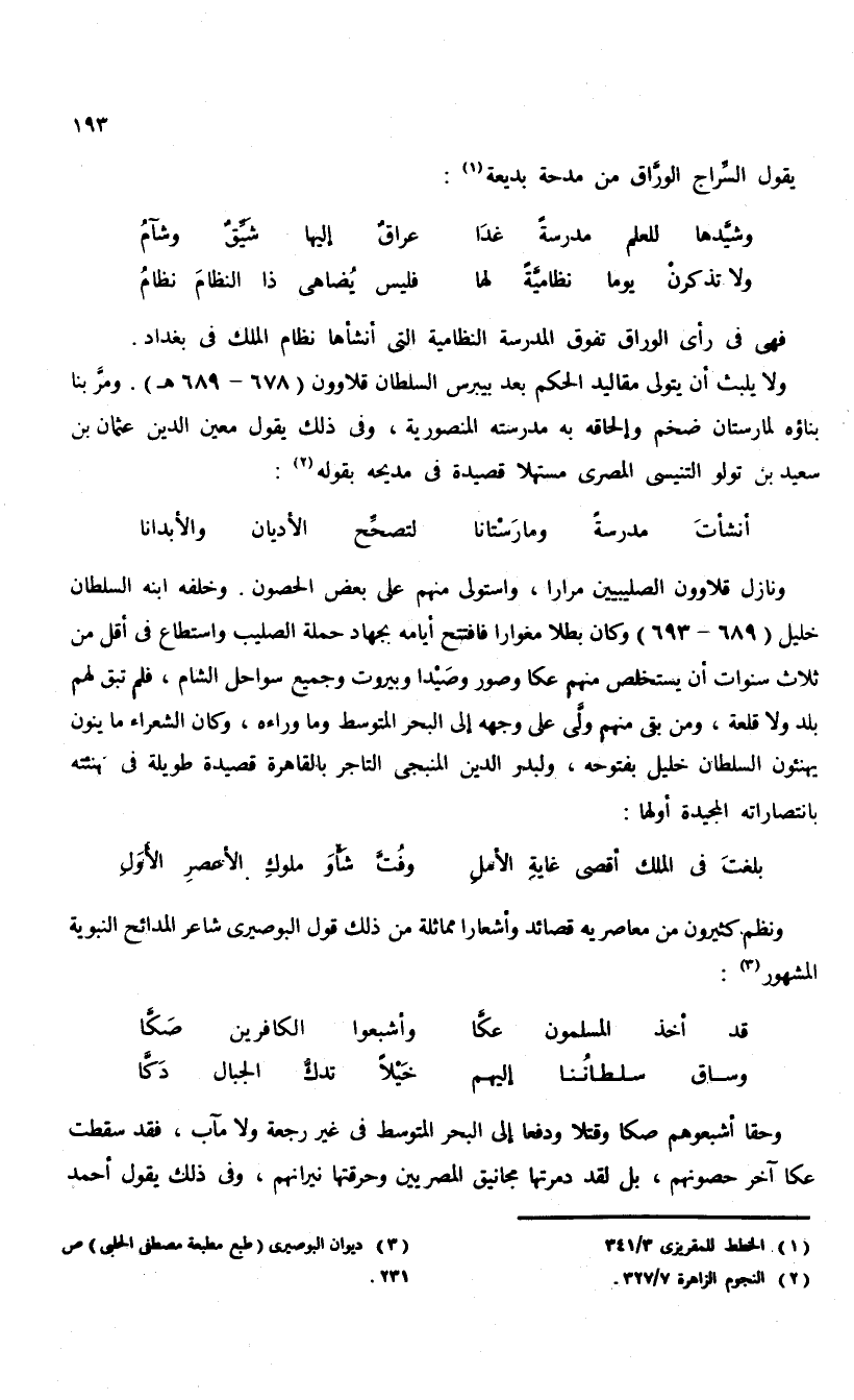 ولا يلبث أن يتولى مقاليد الحكم بعد بيبرس السلطان قلاوون (678 - 689 هـ). ومرّ بنا بناؤه لمارستان ضخم وإلحاقه به مدرسته المنصورية، وفى ذلك يقول معين الدين عثمان بن سعيد بن تولو التنيسى المصرى مستهلا قصيدة فى مديحه بقوله (¬2):