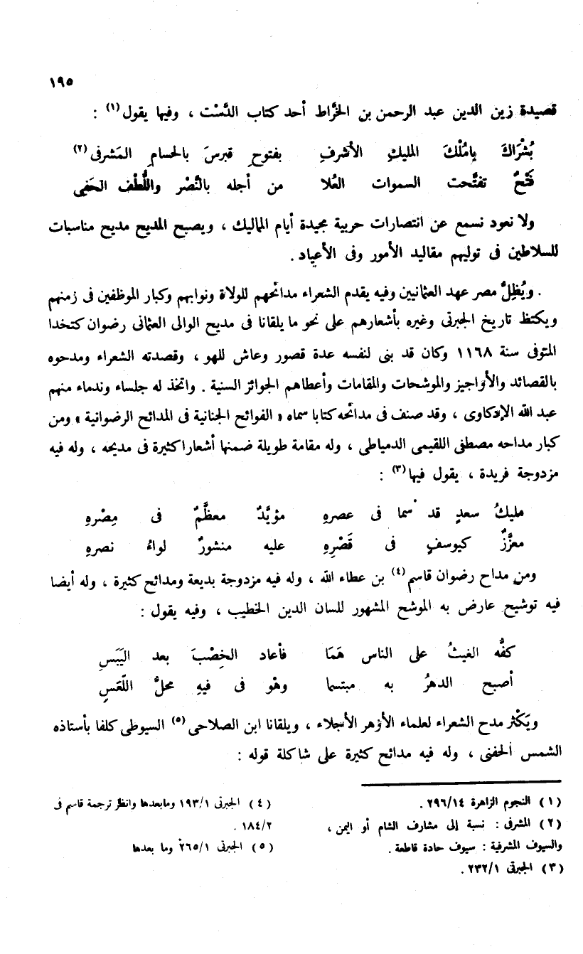 ويكثر مدح الشعراء لعلماء الأزهر الأجلاء، ويلقانا ابن الصلاحى (¬5) السيوطى كلفا بأستاذه الشمس الحفنى، وله فيه مدائح كثيرة على شاكلة قوله: