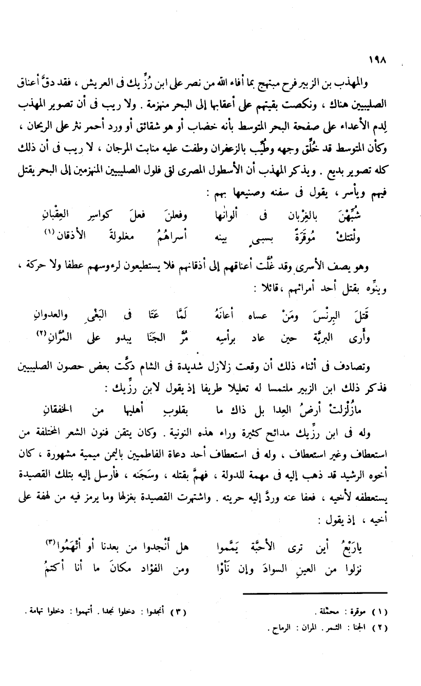 والمهذب بن الزبير فرح مبتهج بما أفاء الله من نصر على ابن رزّيك فى العريش، فقد دقّ أعناق الصليبيين هناك، ونكصت بقيتهم على أعقابها إلى البحر منهزمة. ولا ريب فى أن تصوير المهذب لدم الأعداء على صفحة البحر المتوسط بأنه خضاب أو هو شقائق أو ورد أحمر نثر على الريحان، وكأن المتوسط قد خلّق وجهه وطيّب بالزعفران وطفت عليه منابت المرجان، لا ريب فى أن ذلك كله تصوير بديع. ويذكر المهذب أن الأسطول المصرى لقى فلول الصليبيين المنهزمين إلى البحر يقتل فيهم ويأسر، يقول فى سفنه وصنيعها بهم: