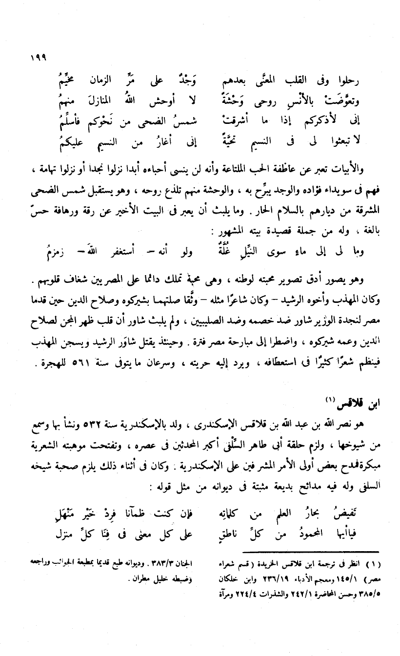 (¬1) انظر فى ترجمة ابن قلاقس الخريدة (قسم شعراء مصر) 1/ 145 ومعجم الأدباء 19/ 236 وابن خلكان 5/ 385 وحسن المحاضرة 1/ 242 والشذرات 4/ 224 ومرآة الجنان 3/ 383. وديوانه طبع قديما بمطبعة الجوائب وراجعه وضبطه خليل مطران.