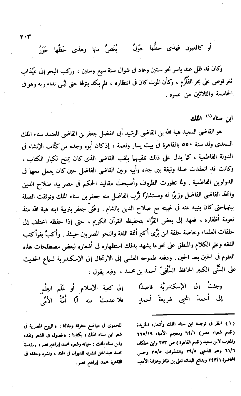 (¬1) انظر فى ترجمة ابن سناء الملك وأشعاره الخريدة (قسم شعراء مصر) 1/ 64 ومعجم الأدباء 19/ 265 والمغرب لابن سعيد (قسم القاهرة) ص 273 وابن خلكان 6/ 61 وعبر الذهبى 5/ 29 والشذرات 5/ 35 وحسن المحاضرة 1/ 243 وبدائع البدائه لعلى بن ظافر وخزانة الأدب للحموى فى مواضع متفرقة ومقالنا: «الروح المصرية فى شعر ابن سناء الملك» بكتابنا: «فصول فى الشعر ونقده وابن سناء الملك: حياته وشعره لمحمد إبراهيم نصر» ومقدمة محمد عبد الحق لنشرته للديوان فى الهند، ونشره وحققه فى القاهرة محمد إبراهيم نصر.