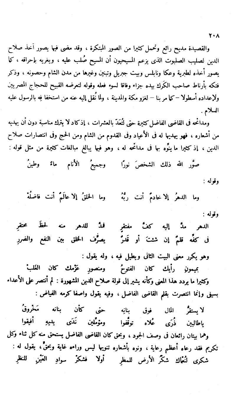 وهما بيتان رائعان فى وصف الجود، وبحق كان القاضى الفاضل يستحق منه كل ثناء وكل تكريم فقد رعاه أعظم رعاية، ونوه بأشعاره تنويها ليس وراءه غاية وبحقّ، يقول له: