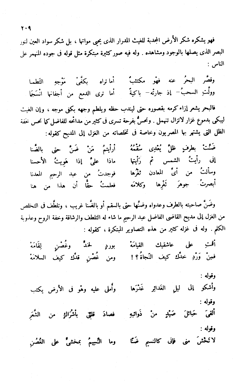فهو يشكره شكر الأرض المجدية للغيث المدرار الذى يحيى مواتها، بل شكر سواد العين لنور البصر الذى يصلها بالوجود ومشاهده. وله فيه صور كثيرة مبتكرة مثل قوله فى جوده المنهمر على الناس: