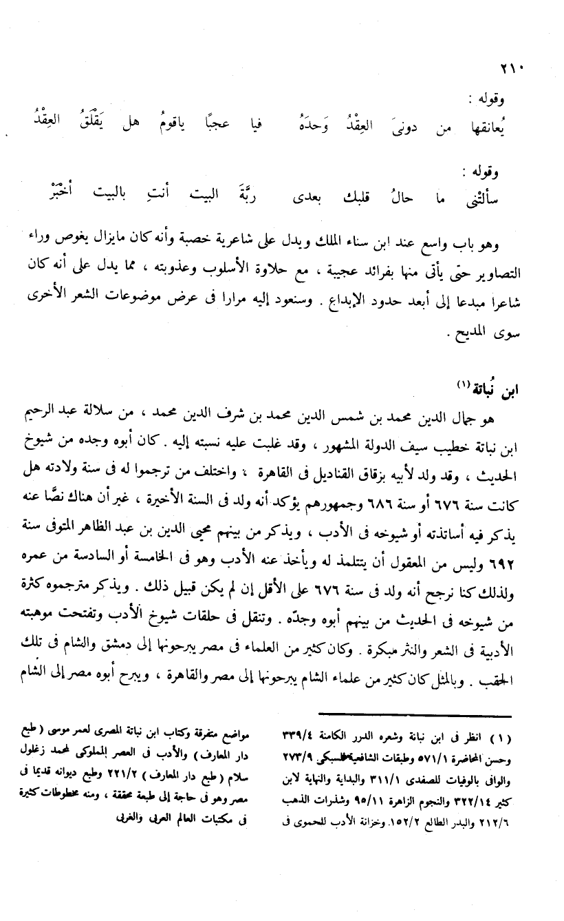 (¬1) انظر فى ابن نباتة وشعره الدرر الكامنة 4/ 339 وحسن المحاضرة 1/ 571 وطبقات الشافعية للسبكى 9/ 273 والوافى بالوفيات للصفدى 1/ 311 والبداية والنهاية لابن كثير 14/ 322 والنجوم الزاهرة 11/ 95 وشذرات الذهب 6/ 212 والبدر الطالع 2/ 152 وخزانة الأدب للحموى فى مواضع متفرقة وكتاب ابن نباتة المصرى لعمر موسى (طبع دار المعارف) والأدب فى العصر المملوكى لمحمد زغلول سلام (طبع دار المعارف) 2/ 221 وطبع ديوانه قديما فى مصر وهو فى حاجة إلى طبعة محققة، ومنه مخطوطات كثيرة فى مكتبات العالم العربى والغربى