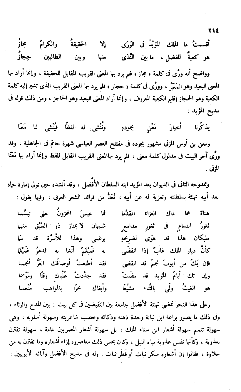 وواضح أنه ورّى فى كلمة «مجاز» فلم يرد بها المعنى القريب المقابل للحقيقة، وإنما أراد بها المعنى البعيد وهو المعبر، وورّى فى كلمة «حجاز» فلم يرد بها المعنى القريب الذى تشير إليه كلمة الكعبة وهو الحجاز إقليم الكعبة المعروف، وإنما أراد المعنى البعيد وهو الحاجز، ومن ذلك قوله فى مديح المؤيد: