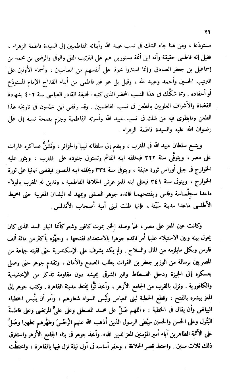 مستودعا، ومن هنا جاء الشك فى نسب عبيد الله وأبنائه الفاطميين إلى السيدة فاطمة الزهراء، فقيل إنه فاطمى حقيقة وأنه ابن أئمة مستورين هم على الترتيب التقى والوفى والرضى بن محمد بن إسماعيل بن جعفر الصادق وإنما استتروا خوفا على أنفسهم من العباسيين، وأسماء الأولين على الترتيب الحسين وأحمد وعبيد الله، وقيل بل هو غير فاطمى من أبناء القداح الإمام المستودع أو أحفاده. ومما شكّك فى هذا النسب المحضر الذى كتبه الخليفة القادر العباسى سنة 402 بشهادة القضاة والأشراف العلويين بالطعن فى نسب الفاطميين. وقد رفض ابن خلدون فى تاريخه هذا الطعن وما يطوى فيه من شك فى نسب عبيد الله وأسرته الفاطمية وجزم بصحة نسبه إلى على رضوان الله عليه والسيدة فاطمة الزهراء.