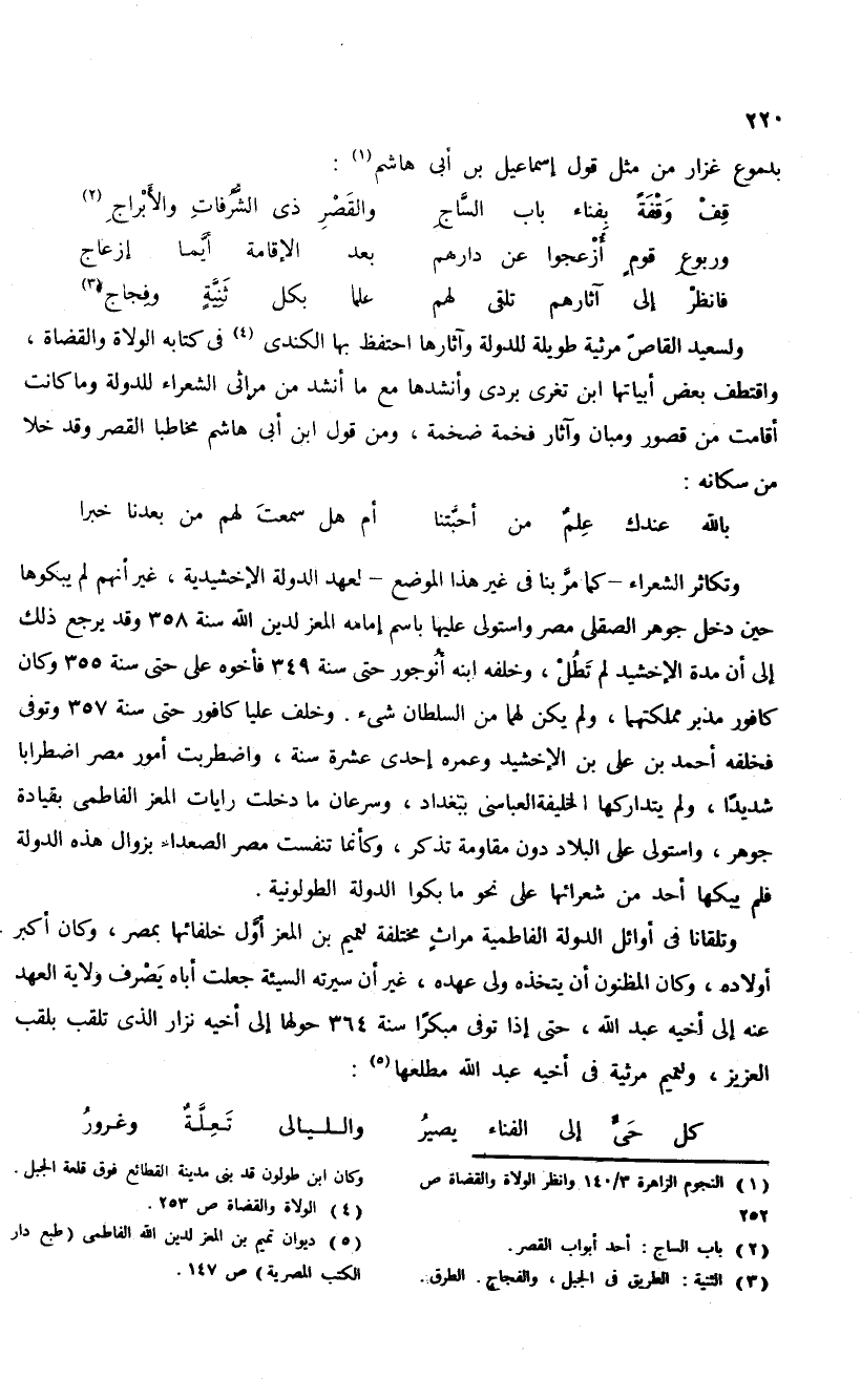 ولسعيد القاصّ مرثية طويلة للدولة وآثارها احتفظ بها الكندى (¬4) فى كتابه الولاة والقضاة، واقتطف بعض أبياتها ابن تغرى بردى وأنشدها مع ما أنشد من مراثى الشعراء للدولة وما كانت أقامت من قصور ومبان وآثار فخمة ضخمة، ومن قول ابن أبى هاشم مخاطبا القصر وقد خلا من سكانه: