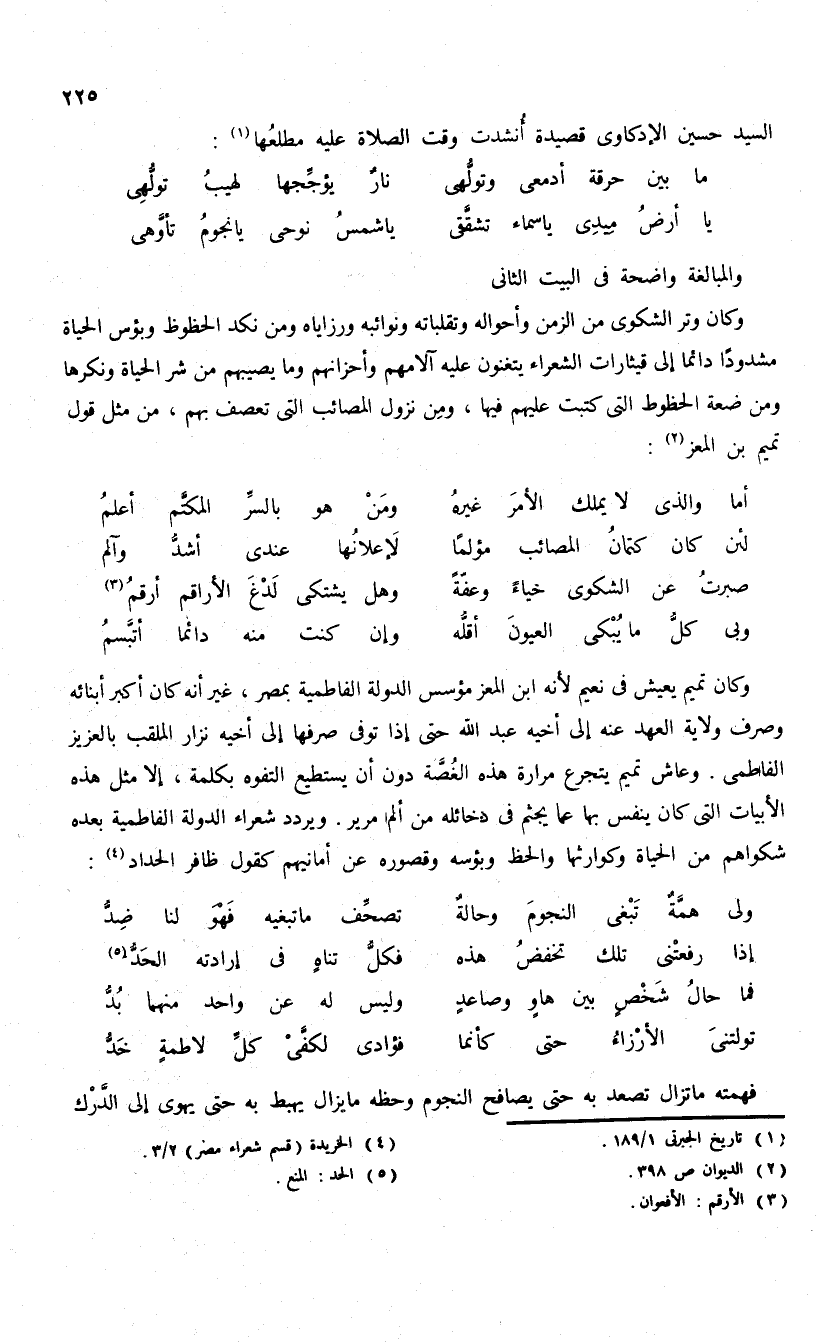 وكان تميم يعيش فى نعيم لأنه ابن المعز مؤسس الدولة الفاطمية بمصر، غير أنه كان أكبر أبنائه وصرف ولاية العهد عنه إلى أخيه عبد الله حتى إذا توفى صرفها إلى أخيه نزار الملقب بالعزيز الفاطمى. وعاش تميم يتجرع مرارة هذه الغصّة دون أن يستطيع التفوه بكلمة، إلا مثل هذه الأبيات التى كان ينفس بها عما يجثم فى دخائله من ألم مرير. ويردد شعراء الدولة الفاطمية بعده شكواهم من الحياة وكوارثها والحظ وبؤسه وقصوره عن أمانيهم كقول ظافر الحداد (¬4):
