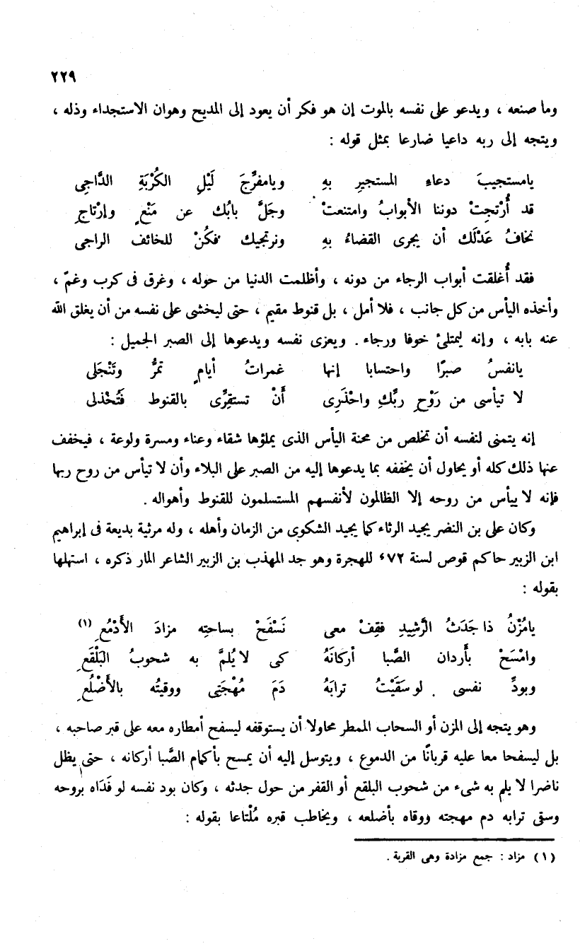 وما صنعه، ويدعو على نفسه بالموت إن هو فكر أن يعود إلى المديح وهوان الاستجداء وذله، ويتجه إلى ربه داعيا ضارعا بمثل قوله: