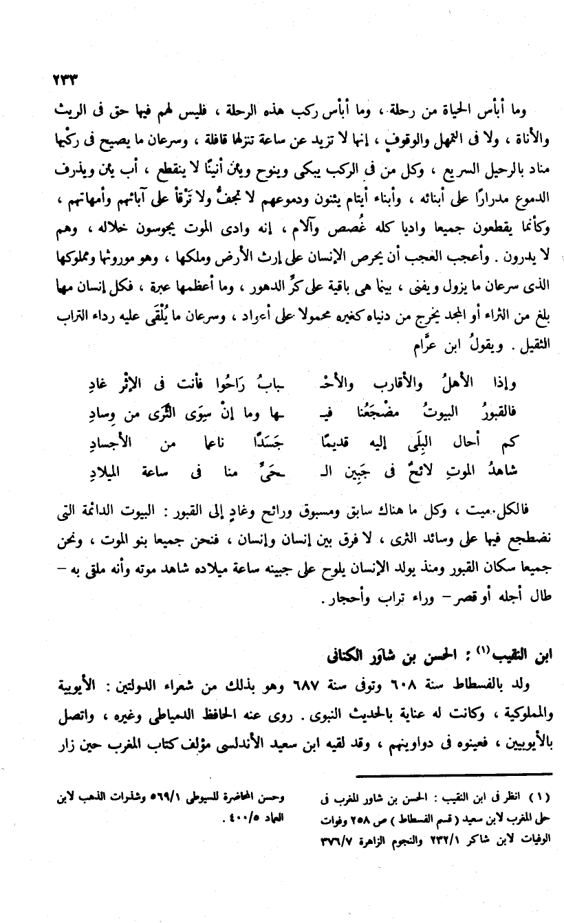 وما أبأس الحياة من رحلة، وما أبأس ركب هذه الرحلة، فليس لهم فيها حق فى الريث والأناة، ولا فى التمهل والوقوف، إنها لا تزيد عن ساعة تنزلها قافلة، وسرعان ما يصيح فى ركبها مناد بالرحيل السريع، وكل من فى الركب يبكى وينوح ويئن أنينا لا ينقطع، أب يئن ويذرف الدموع مدرارا على أبنائه، وأبناء أيتام يئنون ودموعهم لا تجف ولا ترقا على آبائهم وأمهاتهم، وكأنما يقطعون جميعا واديا كله غصص وآلام، إنه وادى الموت يجوسون خلاله، وهم لا يدرون. وأعجب العجب أن يحرص الإنسان على إرث الأرض وملكها، وهو موروثها ومملوكها الذى سرعان ما يزول ويفنى، بينما هى باقية على كرّ الدهور، وما أعظمها عبرة، فكل إنسان مهما بلغ من الثراء أو المجد يخرج من دنياه كغيره محمولا على أعواد، وسرعان ما يلقى عليه رداء التراب الثقيل. ويقول ابن عرّام