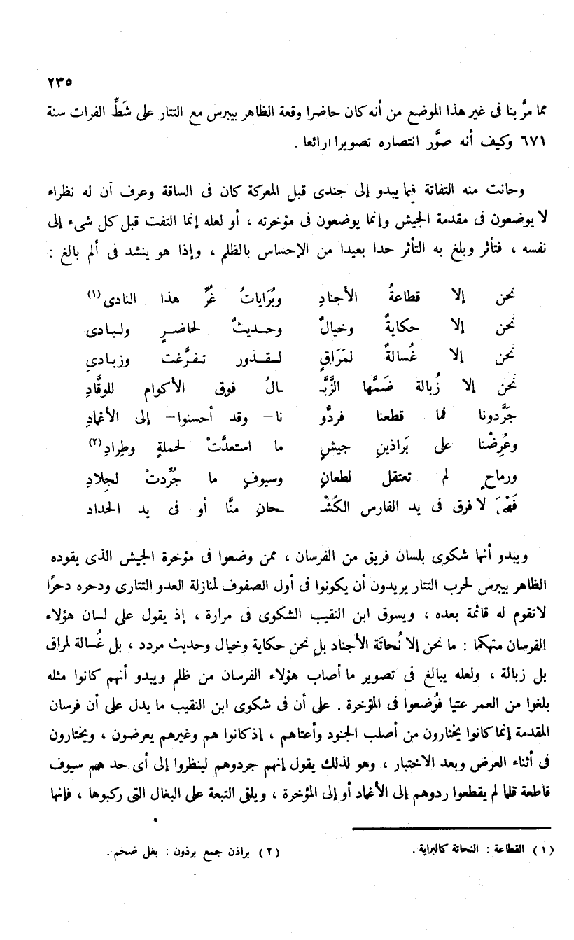 مما مرّ بنا فى غير هذا الموضع من أنه كان حاضرا وقعة الظاهر بيبرس مع التتار على شطّ الفرات سنة 671 وكيف أنه صوّر انتصاره تصويرا رائعا.