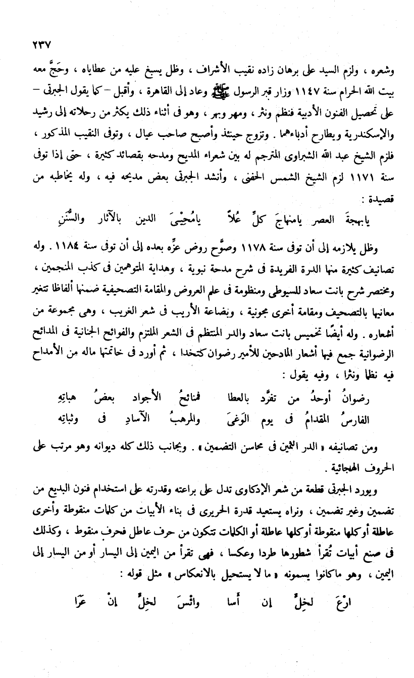 وشعره، ولزم السيد على برهان زاده نقيب الأشراف، وظل يسبغ عليه من عطاياه، وحجّ معه بيت الله الحرام سنة 1147 وزار قبر الرسول صلّى الله عليه وسلم وعاد إلى القاهرة، وأقبل-كما يقول الجبرتى- على تحصيل الفنون الأدبية فنظم ونثر، ومهر وبهر، وهو فى أثناء ذلك يكثر من رحلاته إلى رشيد والإسكندرية ويطارح أدباءهما. وتزوج حينئذ وأصبح صاحب عيال، وتوفى النقيب المذكور، فلزم الشيخ عبد الله الشبراوى المترجم له بين شعراء المديح ومدحه بقصائد كثيرة، حتى إذا توفى سنة 1171 لزم الشيخ الشمس الحفنى، وأنشد الجبرتى بعض مديحه فيه، وله يخاطبه من قصيدة: