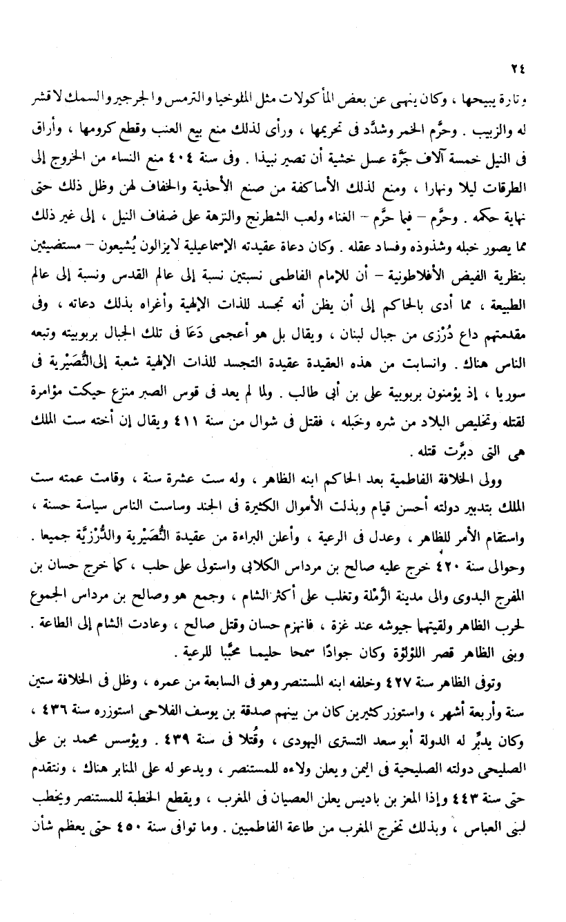 وتارة يبيحها، وكان ينهى عن بعض المأكولات مثل الملوخيا والترمس والجرجير والسمك لا قشر له والزبيب. وحرّم الخمر وشدّد فى تحريمها، ورأى لذلك منع بيع العنب وقطع كرومها، وأراق فى النيل خمسة آلاف جرّة عسل خشية أن تصير نبيذا. وفى سنة 404 منع النساء من الخروج إلى الطرقات ليلا ونهارا، ومنع لذلك الأساكفة من صنع الأحذية والخفاف لهن وظل ذلك حتى نهاية حكمه. وحرّم-فيما حرّم-الغناء ولعب الشطرنج والنزهة على ضفاف النيل، إلى غير ذلك مما يصور خبله وشذوذه وفساد عقله. وكان دعاة عقيدته الإسماعيلية لا يزالون يشيعون-مستضيئين بنظرية الفيض الأفلاطونية-أن للإمام الفاطمى نسبتين نسبة إلى عالم القدس ونسبة إلى عالم الطبيعة، مما أدى بالحاكم إلى أن يظن أنه تجسد للذات الإلهية وأغراه بذلك دعاته، وفى مقدمتهم داع درزى من جبال لبنان، ويقال بل هو أعجمى دعا فى تلك الجبال بربوبيته وتبعه الناس هناك. وانسابت من هذه العقيدة عقيدة التجسد للذات الإلهية شعبة إلى النّصيرية فى سوريا، إذ يؤمنون بربوبية على بن أبى طالب. ولما لم يعد فى قوس الصبر منزع حيكت مؤامرة لقتله وتخليص البلاد من شره وخبله، فقتل فى شوال من سنة 411 ويقال إن أخته ست الملك هى التى دبّرت قتله.