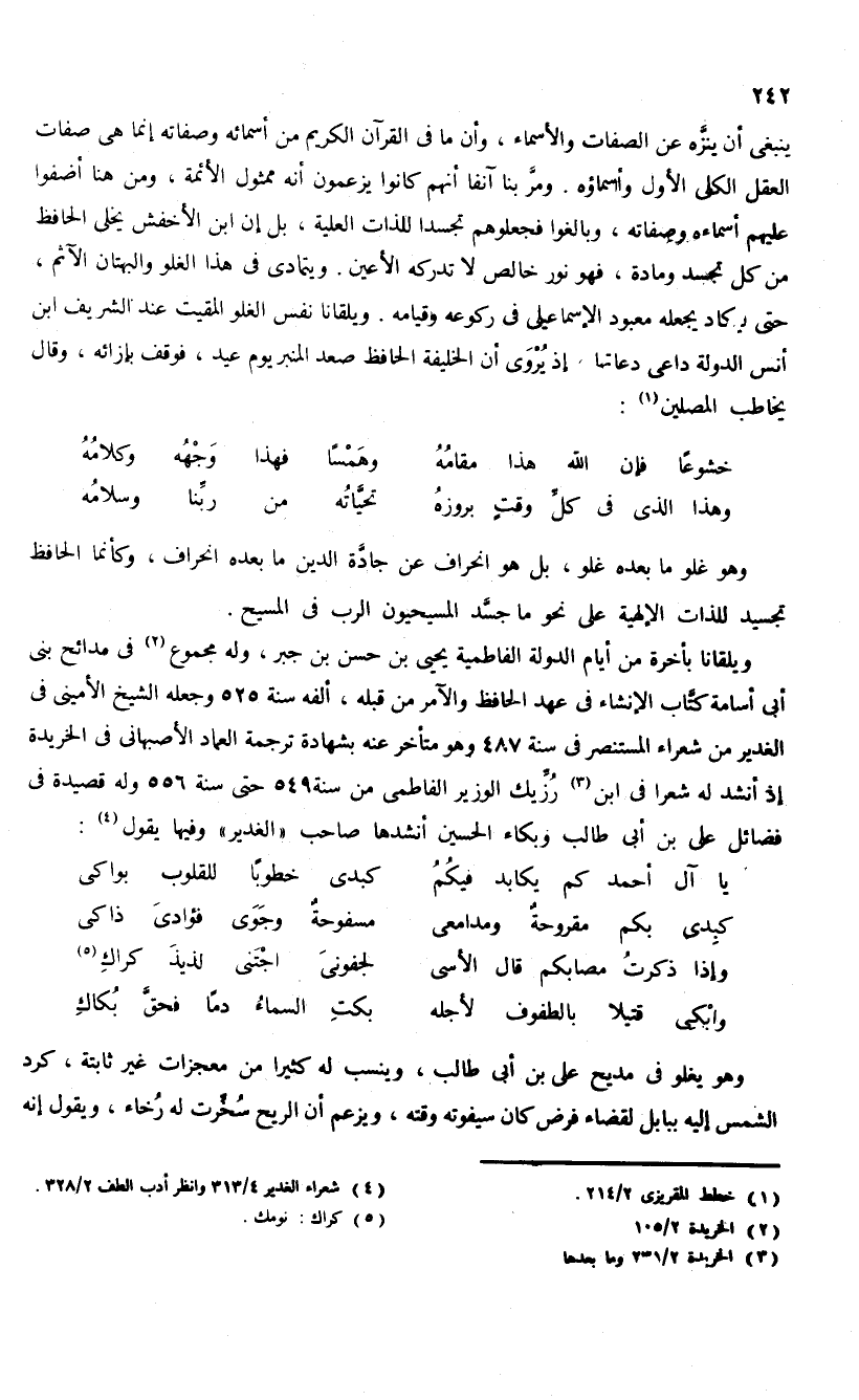 ينبغى أن ينزّه عن الصفات والأسماء، وأن ما فى القرآن الكريم من أسمائه وصفاته إنما هى صفات العقل الكلى الأول وأسماؤه. ومرّ بنا آنفا أنهم كانوا يزعمون أنه ممثول الأئمة، ومن هنا أضفوا عليهم أسماءه وصفاته، وبالغوا فجعلوهم تجسدا للذات العلية، بل إن ابن الأخفش يخلى الحافظ من كل تجسد ومادة، فهو نور خالص لا تدركه الأعين. ويتمادى فى هذا الغلو والبهتان الآثم، حتى ليكاد يجعله معبود الإسماعيلى فى ركوعه وقيامه. ويلقانا نفس الغلو المقيت عند الشريف ابن أنس الدولة داعى دعاتها، إذ يروى أن الخليفة الحافظ صعد المنبر يوم عيد، فوقف بإزائه، وقال يخاطب المصلين (¬1):