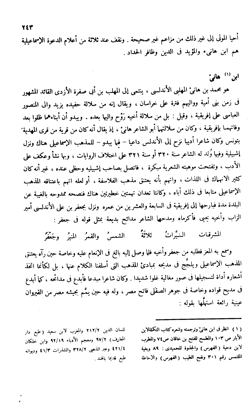 أحيا الموتى إلى غير ذلك من مزاعم غير صحيحة. ونقف عند ثلاثة من أعلام الدعوة الإسماعيلية هم ابن هانئ والمؤيد فى الدين وظافر الحداد.