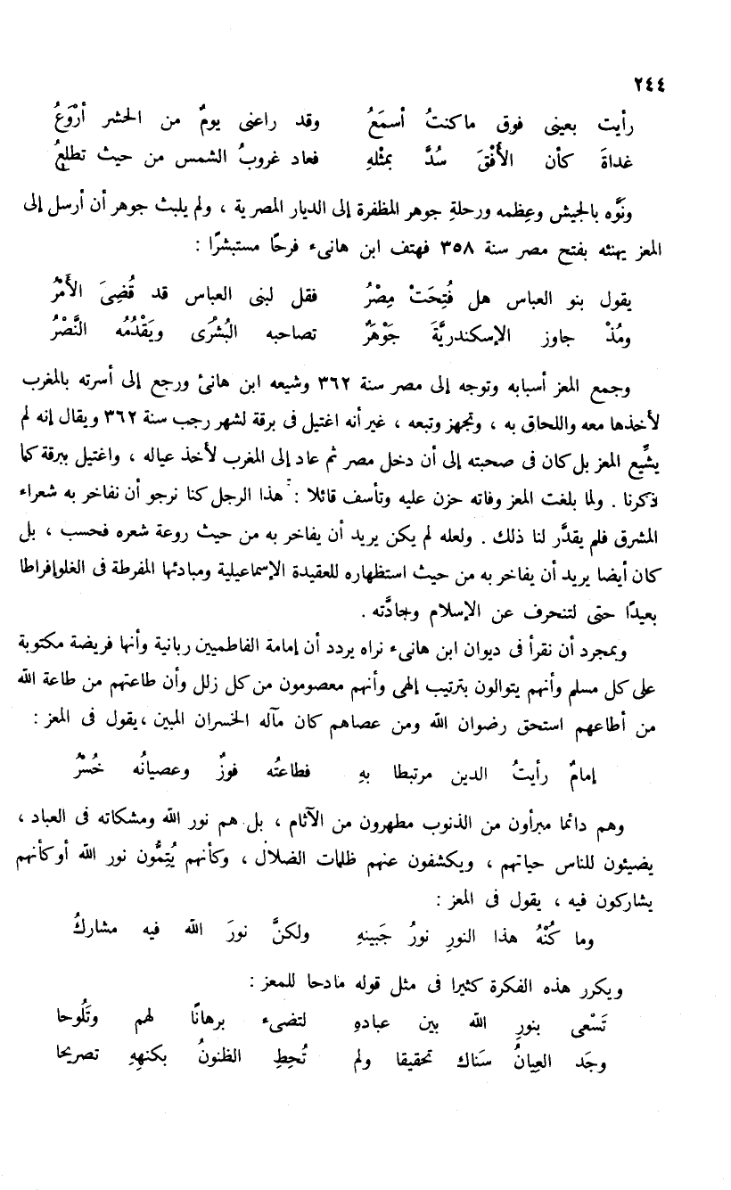 ونوّه بالجيش وعظمه ورحلة جوهر المظفرة إلى الديار المصرية، ولم يلبث جوهر أن أرسل إلى المعز يهنئه بفتح مصر سنة 358 فهتف ابن هانئ فرحا مستبشرا: