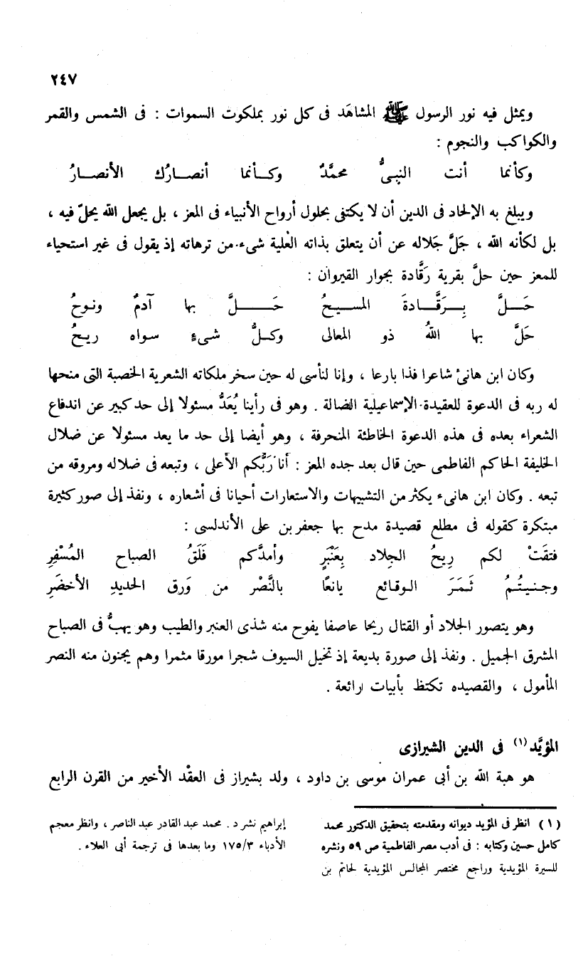(¬1) انظر فى المؤيد ديوانه ومقدمته بتحقيق الدكتور محمد كامل حسين وكتابه: فى أدب مصر الفاطمية ص 59 ونشره للسيرة المؤيدية وراجع مختصر المجالس المؤيدية لحاتم بن إبراهيم نشرد. محمد عبد القادر عبد الناصر، وانظر معجم الأدباء 3/ 175 وما بعدها فى ترجمة أبى العلاء.
