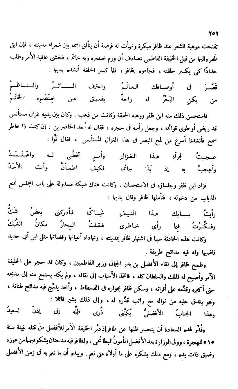 فزاد ابن ظفر وجلساؤه فى الاستحسان. وكانت هناك شبكة مسدولة على باب المجلس تمنع الذباب من دخوله، فتأملها ظافر وقال بديها: