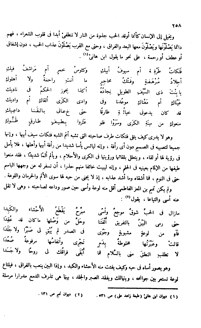 ويخيل إلى الإنسان كأنما أوقد الحب جذوة من النار لا تنطفئ أبدا فى قلوب الشعراء، فهم دائما يصلونها ويصلون معها البعد والفراق، وحتى مع القرب يصلون عذاب الحب، دون إشفاق أو عطف أو رحمة، على نحو ما يقول ابن هانئ (¬1).