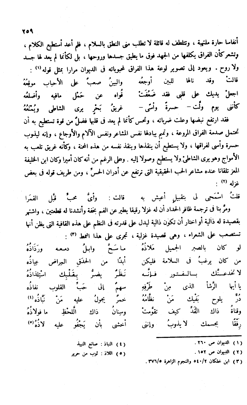 أنفاسا حارة ملتهبة، وتتلطف له قائلة لا تطلب منى النطق بالسلام، فلم أعد أستطيع الكلام، وتشعر كأن الفراق يكلفها من الجهد فوق ما يطيق جسدها وروحها، بل لكأنما لم يعد لها جسد ولا روح. ويعود إلى تصوير لوعة هذا الفراق لمحبوباته فى الديوان مرارا بمثل قوله (¬1):