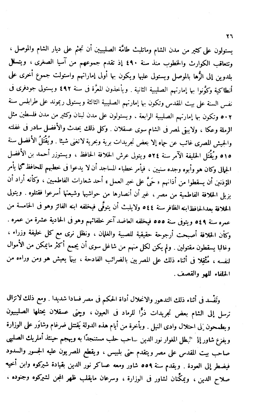يستولون على كثير من مدن الشام وما تلبث طامّة الصليبيين أن تجثم على ديار الشام والموصل، وتتعاقب الكوارث والخطوب منذ سنة 490 إذ تقدم جموعهم من آسيا الصغرى، ويتسلل بلدوين إلى الرّها بالموصل ويستولى عليها ويكون بها أولى إماراتهم واستولت جموع أخرى على أنطاكية وكوّنوا بها إمارتهم الصليبية الثانية. ويأخذون المعرّة فى سنة 492 ويستولى جودفرى فى نفس السنة على بيت المقدس وتكون بها إمارتهم الصليبية الثالثة ويستولى ريموند على طرابلس سنة 502 وتكون بها إمارتهم الصليبية الرابعة، ويستولون على مدن لبنان وكثير من مدن فلسطين مثل الرملة وعكا، ولا يبقى لمصر فى الشام سوى عسقلان. وكل ذلك يحدث والأفضل سادر فى غفلته والجيش المصرى غائب عن حماه إلا بعض تجريدات برية وبحرية لا تغنى شيئا. ويقتل الأفضل سنة 515 ويقتل الخليفة الآمر سنة 524 ويتولى عرش الخلافة الحافظ، ويستوزر أحمد بن الأفضل الجمالى وكان هو وأبوه وجده سنيين، فيأمر خطباء المساجد أن لا يدعوا فى خطبهم للحافظ كما يأمر المؤذنين أن يسقطوا من أذانهم «حىّ على خير العمل» أحد شعارات الفاطميين، وكأنه أراد أن يزيل الخلافة الفاطمية من مصر، غير أن أنصارها من حواشيها وشيعتها أسرعوا فقتلوه. ويتولى الخلافة بعد الحافظ ابنه الظافر سنة 544 ولا يلبث أن يتوفّى فيخلفه ابنه الفائز وهو فى الخامسة من عمره سنة 549 ويتوفى سنة 555 فيخلفه العاضد آخر خلفائهم وهو فى الحادية عشرة من عمره.