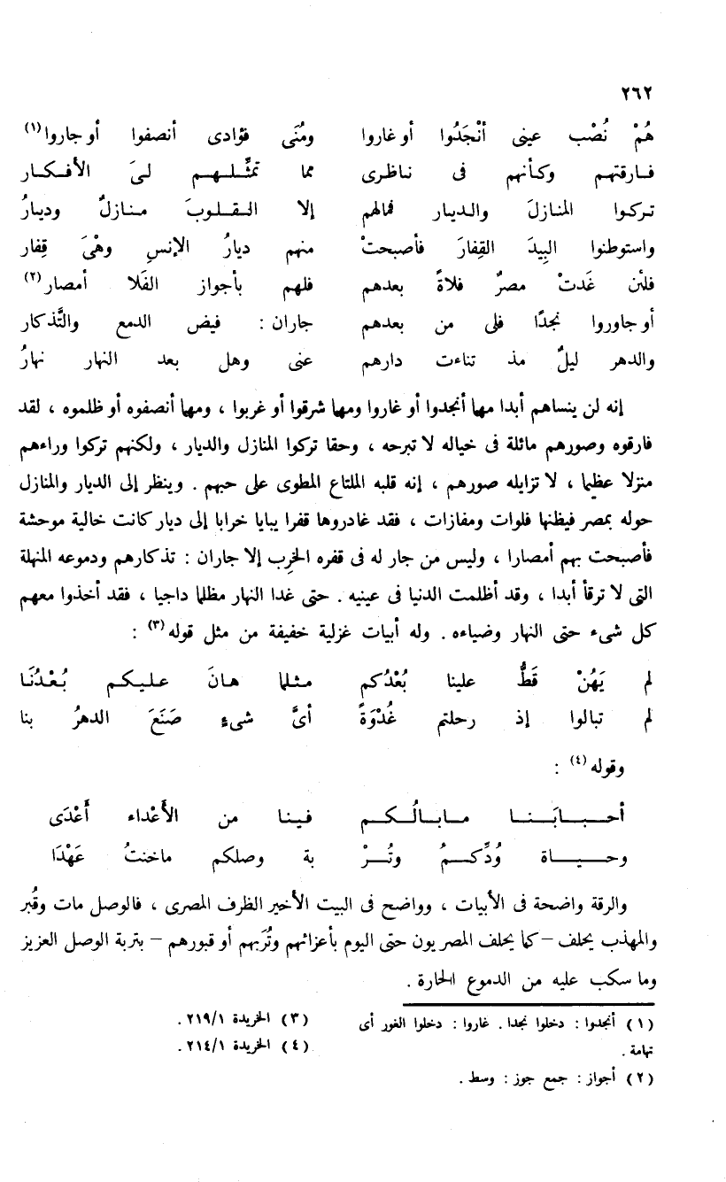 إنه لن ينساهم أبدا مهما أنجدوا أو غاروا ومهما شرقوا أو غربوا، ومهما أنصفوه أو ظلموه، لقد فارقوه وصورهم مائلة فى خياله لا تبرحه، وحقا تركوا المنازل والديار، ولكنهم تركوا وراءهم منزلا عظيما، لا تزايله صورهم، إنه قلبه الملتاع المطوى على حبهم. وينظر إلى الديار والمنازل حوله بمصر فيظنها فلوات ومفازات، فقد غادروها قفرا يبايا خرابا إلى ديار كانت خالية موحشة فأصبحت بهم أمصارا، وليس من جار له فى قفره الخرب إلا جاران: تذكارهم ودموعه المنهلة التى لا ترقأ أبدا، وقد أظلمت الدنيا فى عينيه. حتى غدا النهار مظلما داجيا، فقد أخذوا معهم كل شئ حتى النهار وضياءه. وله أبيات غزلية خفيفة من مثل قوله (¬3):