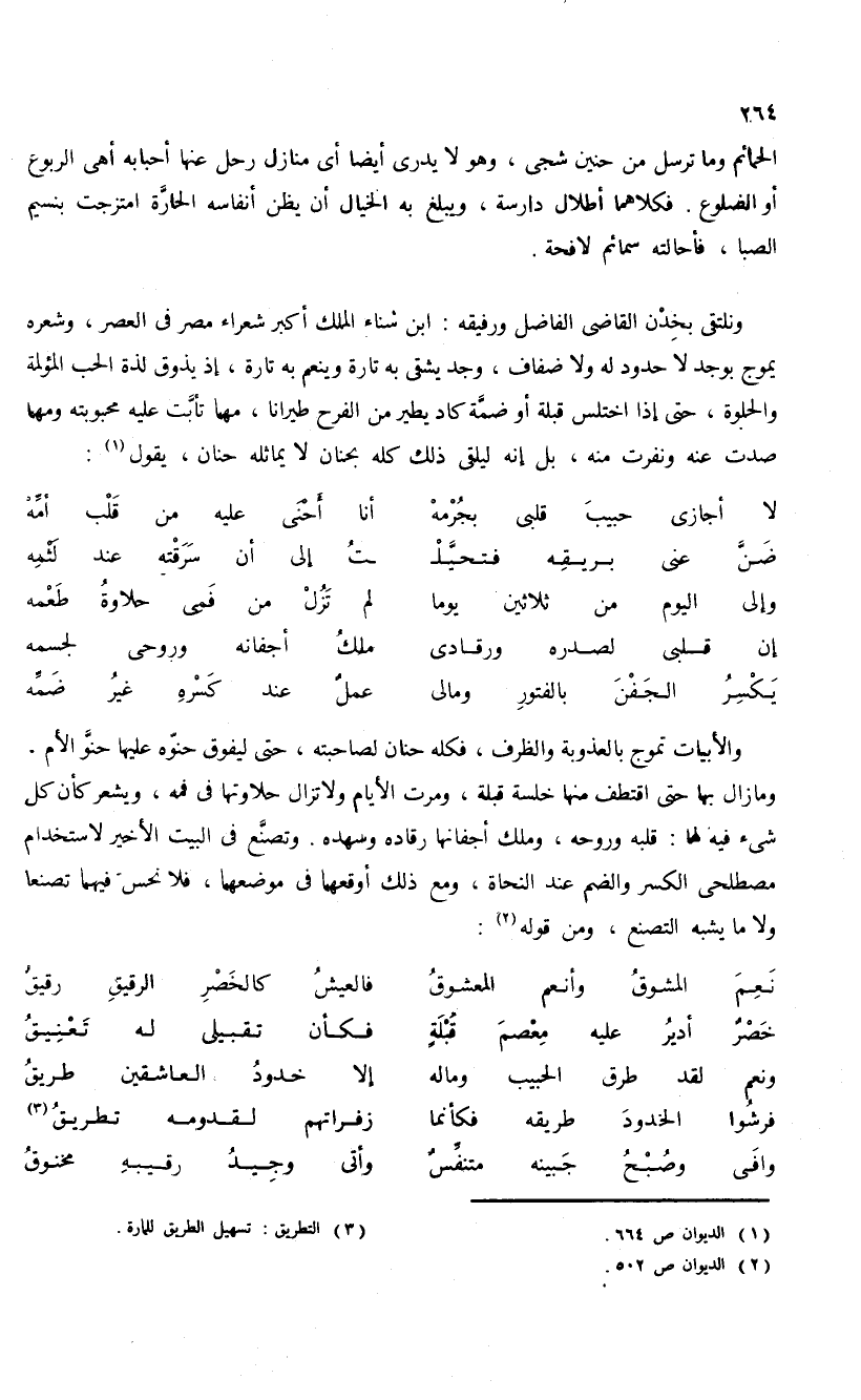 ومازال بها حتى اقتطف منها خلسة قبلة، ومرت الأيام ولا تزال حلاوتها فى فمه، ويشعر كأن كل شئ فيه لها: قلبه وروحه، وملك أجفانها رقاده وسهده. وتصنّع فى البيت الأخير لاستخدام مصطلحى الكسر والضم عند النحاة، ومع ذلك أوقعهما فى موضعهما، فلا نحس فيهما تصنعا ولا ما يشبه التصنع، ومن قوله (¬2):