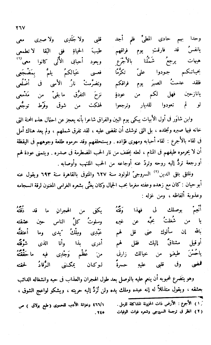 (¬2) انظر فى ترجمة السروجى وشعره فوات الوفيات 1/ 466 وخزانة الأدب للحموى (طبع بولاق) ص 245.