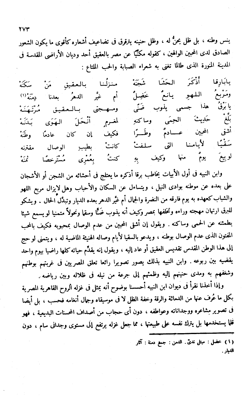 ينس وطنه، بل ظل يحنّ له، وظل حنينه يترقرق فى تضاعيف أشعاره كأقوى ما يكون الشعور الصادق لدى المحبين الوالهين، كقوله مكنيّا عن مصر بالعقيق أحد وديان الأراضى المقدسة فى المدينة المنورة الذى طالما تغنى به شعراء الصبابة والحب الملتاع: