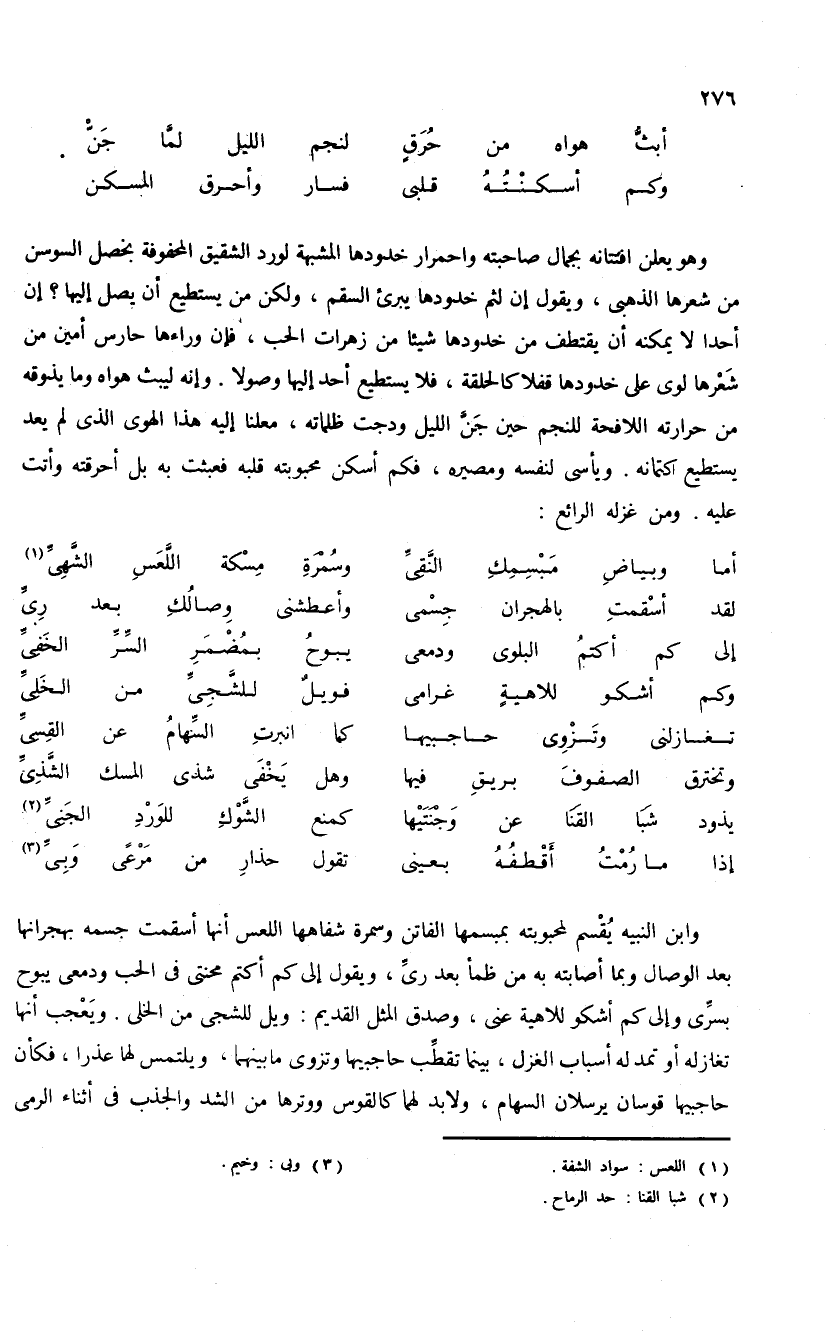 وهو يعلن افتتانه بجمال صاحبته واحمرار خدودها المشبهة لورد الشقيق المحفوفة بخصل السوسن من شعرها الذهبى، ويقول إن لثم خدودها يبرئ السقم، ولكن من يستطيع أن يصل إليها؟ إن أحدا لا يمكنه أن يقتطف من خدودها شيئا من زهرات الحب، فإن وراءها حارس أمين من شعرها لوى على خدودها قفلا كالحلقة، فلا يستطيع أحد إليها وصولا. وإنه ليبث هواه وما يذوقه من حرارته اللافحة للنجم حين جنّ الليل ودجت ظلماته، معلنا إليه هذا الهوى الذى لم يعد يستطيع اكتمانه. ويأسى لنفسه ومصيره، فكم أسكن محبوبته قلبه فعبثت به بل أحرقته وأتت عليه. ومن غزله الرائع: